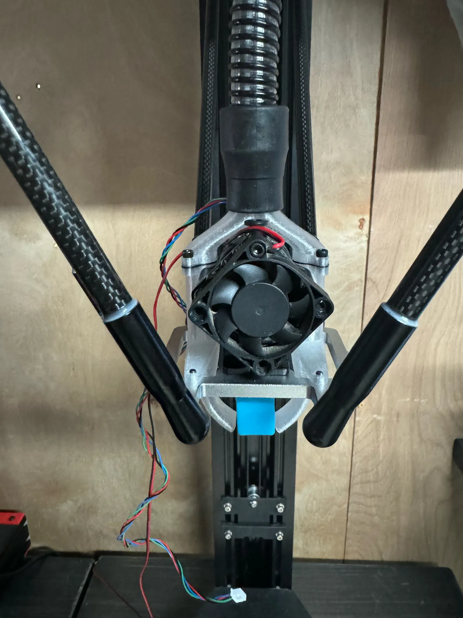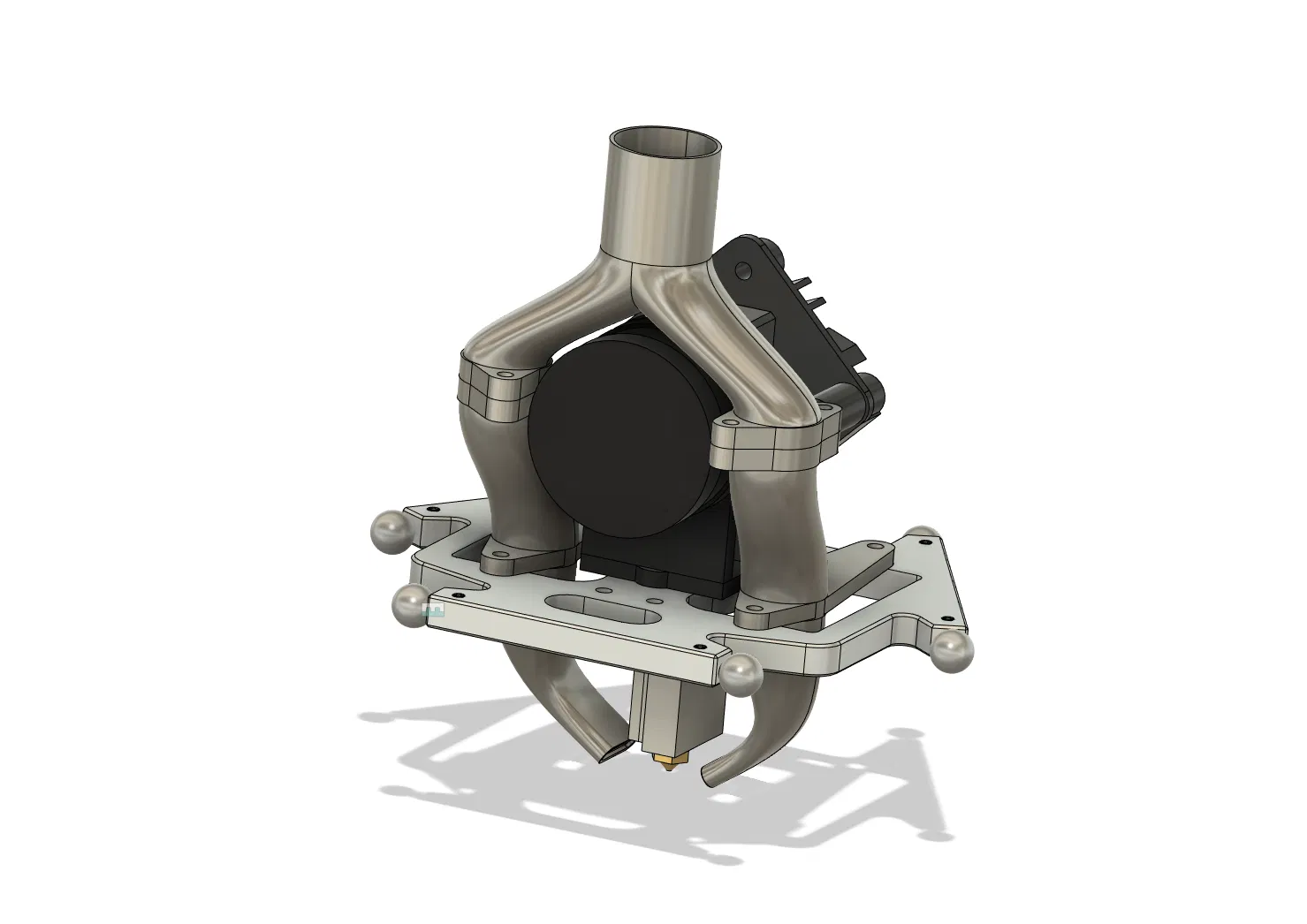 Tôi đề xuất bắt vít Ống trên (Upper Duct) vào cả hai Ống dưới (Lower Ducts) cùng với gioăng trước khi lắp vào effector. Bạn cần cẩn thận kéo giãn nó quanh bộ đùn (extruder) để làm việc này. Các vít sẽ ăn ren vào nhựa để tiết kiệm chút trọng lượng so với việc dùng inserts.