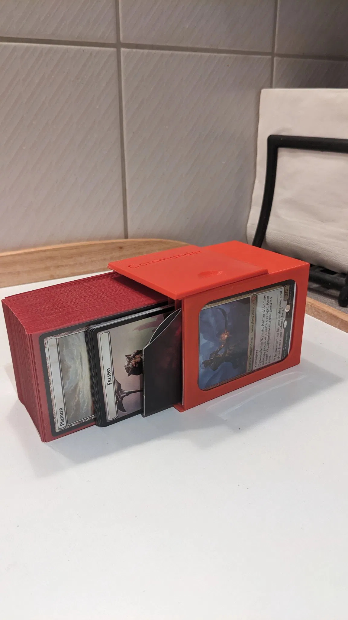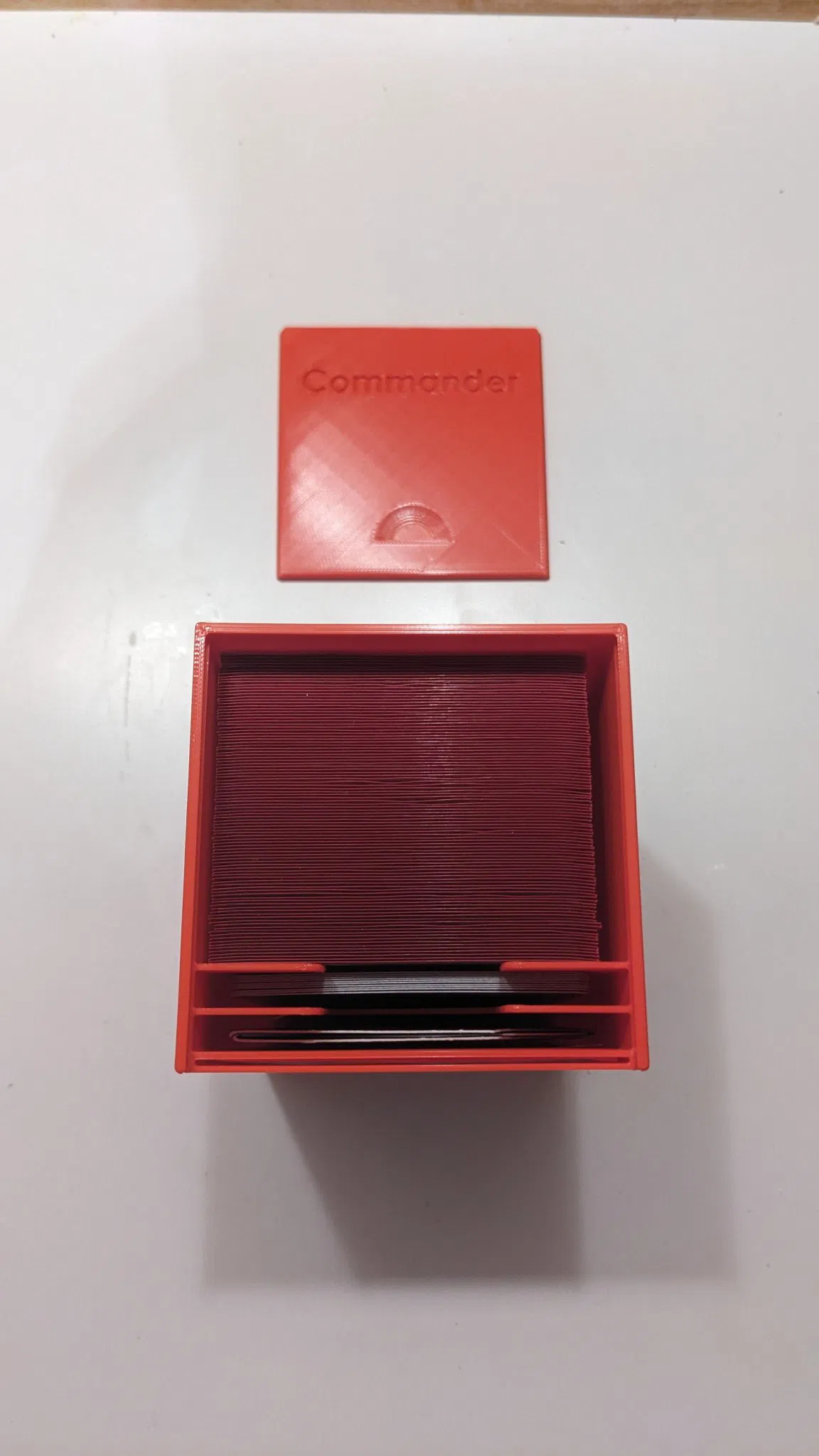 Ở mặt trước, bạn có thể chèn một Thẻ Nghệ Thuật từ các gói mới để tùy chỉnh hộp (như trong mẫu đã xuất bản trước đó cho bộ bài thông thường). Ngoài ra, bạn có thể chèn thẻ chỉ huy của mình. Hộp bài Commander có một khe cho bộ bài 100 lá, một khe cho token và một khe cho bộ đếm mạng sống.