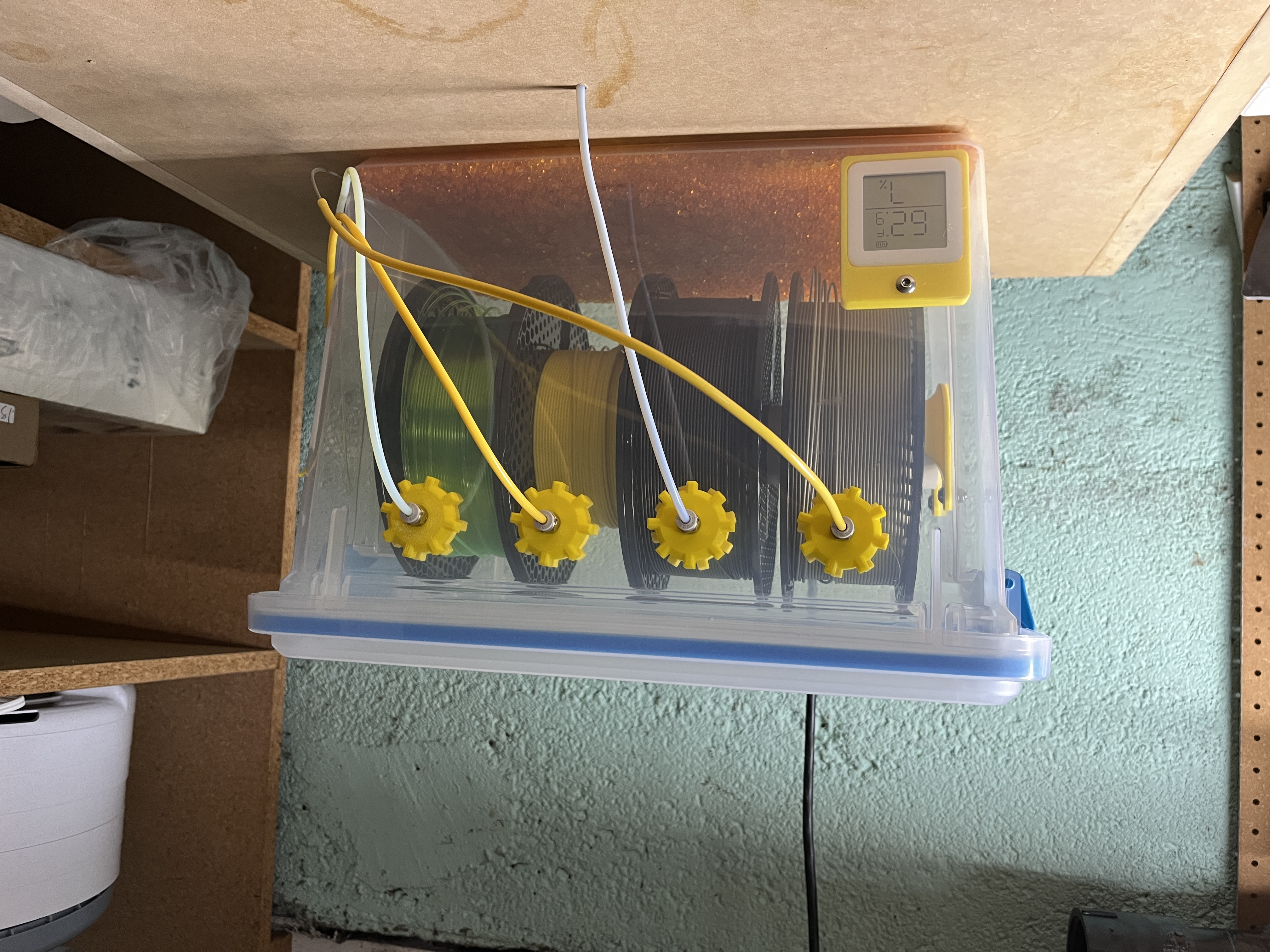 Cái đế này dùng để gắn đồng hồ đo nhiệt độ/độ ẩm SwitchBot. Tui thiết kế nó để gắn bên trong thùng đựng filament khô, chỉ cần dùng ốc M5 và nhét đồng hồ vô là xong. Rất tiện lợi cho anh em chơi filament.