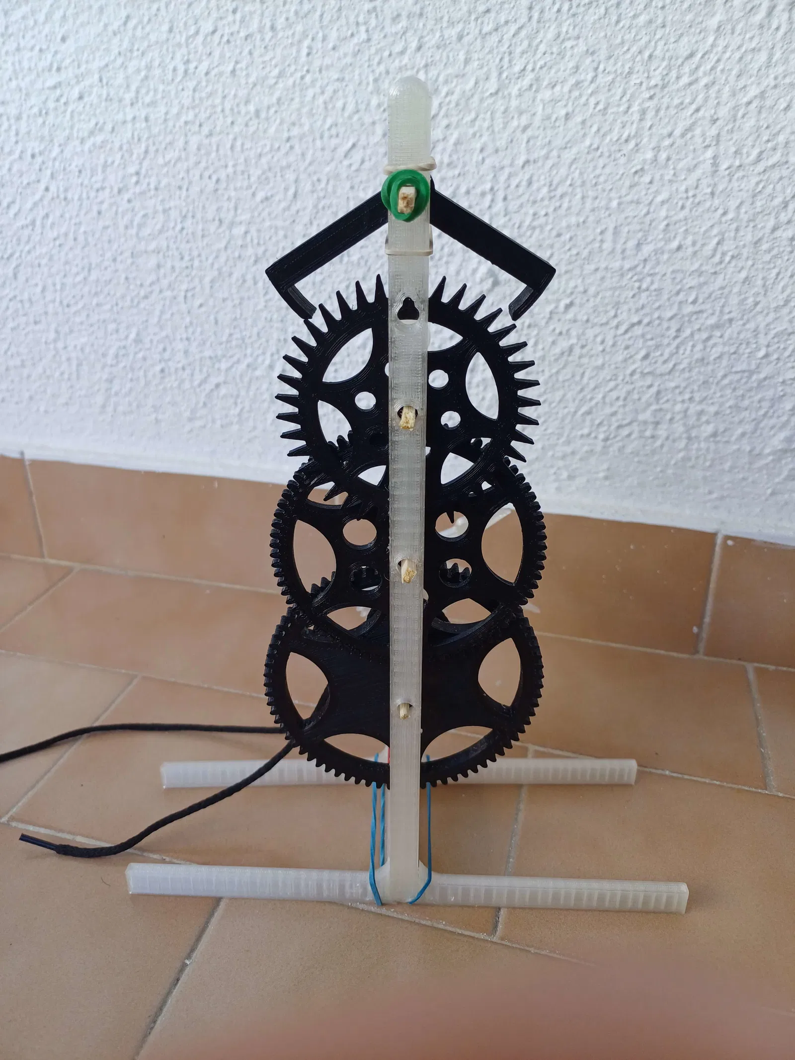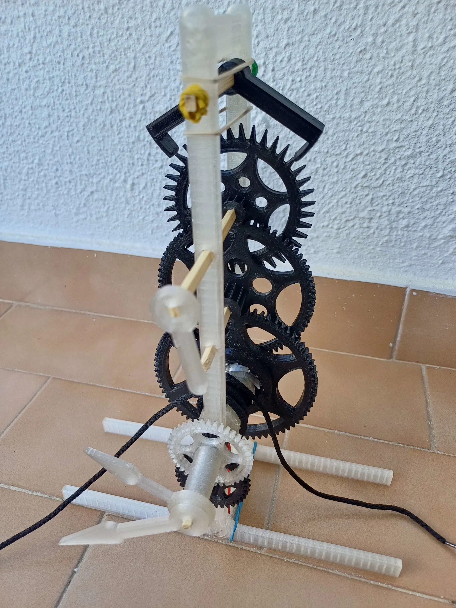 Tất cả mã Scad đều có trên trang này và dễ dàng chỉnh sửa. Cách các bộ phận khớp với nhau lẽ ra phải trực quan và dễ hiểu từ ảnh chụp, ngoại trừ dây cho quả cân. Dây nên được cuộn và buộc nhẹ quanh bánh xe dây (được tạo ra bằng cách nối nắp bánh xe dây và bánh răng giữ dây với 2 thanh/cọc) như trong ví dụ, và không được cản trở chuyển động quay của trục bánh răng đi qua tâm của bánh xe dây. Dây nên được buộc vào 2 quả cân, mỗi quả ở một đầu, với quả nặng hơn ở bên phải của bộ máy, nó phải là trọng lượng tối thiểu cần thiết để bánh răng di chuyển mượt mà.