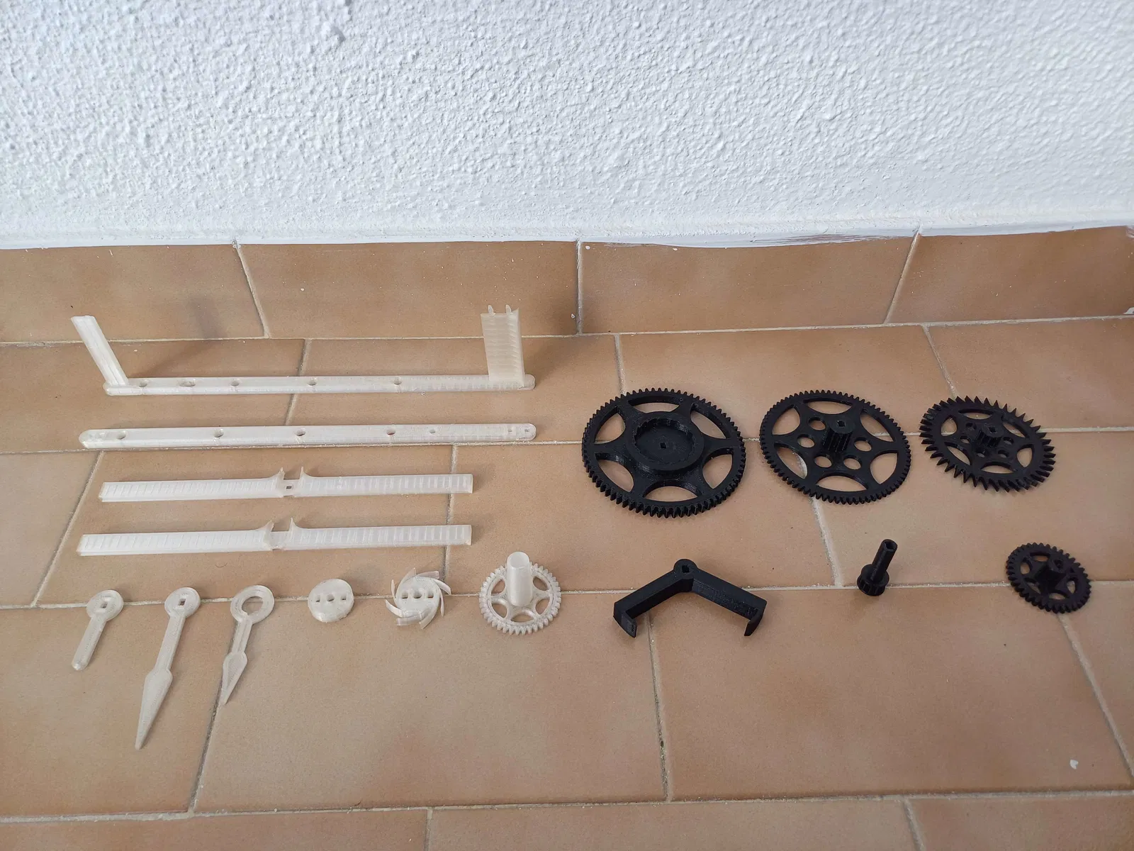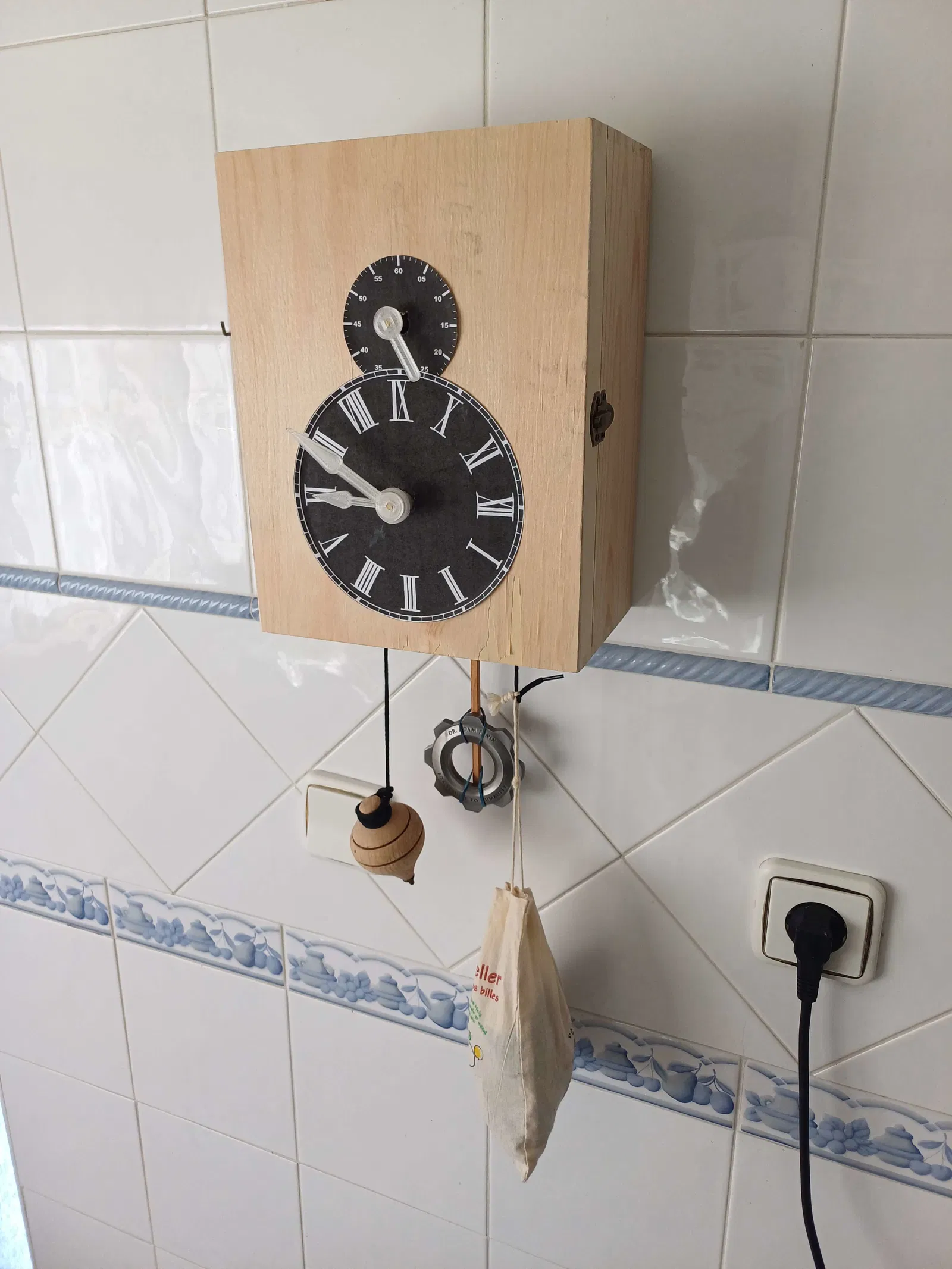Tui đã cố gắng giảm thiểu tối đa số lượng bộ phận in 3D nhất có thể (chỉ có bánh răng, giá đỡ bộ máy, kim đồng hồ và bộ phận giữ con lắc), nên hộp, mặt đồng hồ, con lắc, dây và quả cân đều là những vật dụng tui tạm thời sử dụng.