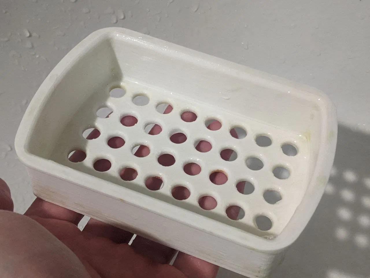 Khay đơn giản cho cục xà bông với lỗ thoát nước. Cái trong ảnh đã xài 2 năm rồi nha.
