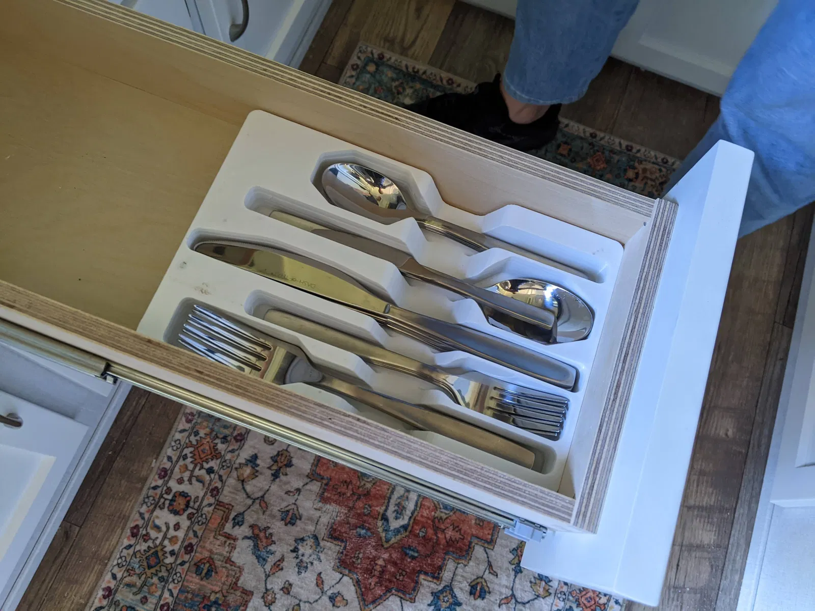 Cái khay chia muỗng nĩa nhỏ gọn, tùy chỉnh được cho ngăn kéo hẹp. Mẫu này vừa khít với ngăn kéo của chiếc xe RV Escape 19 của một người bạn và cố định bộ dao nĩa của họ một cách chính xác.