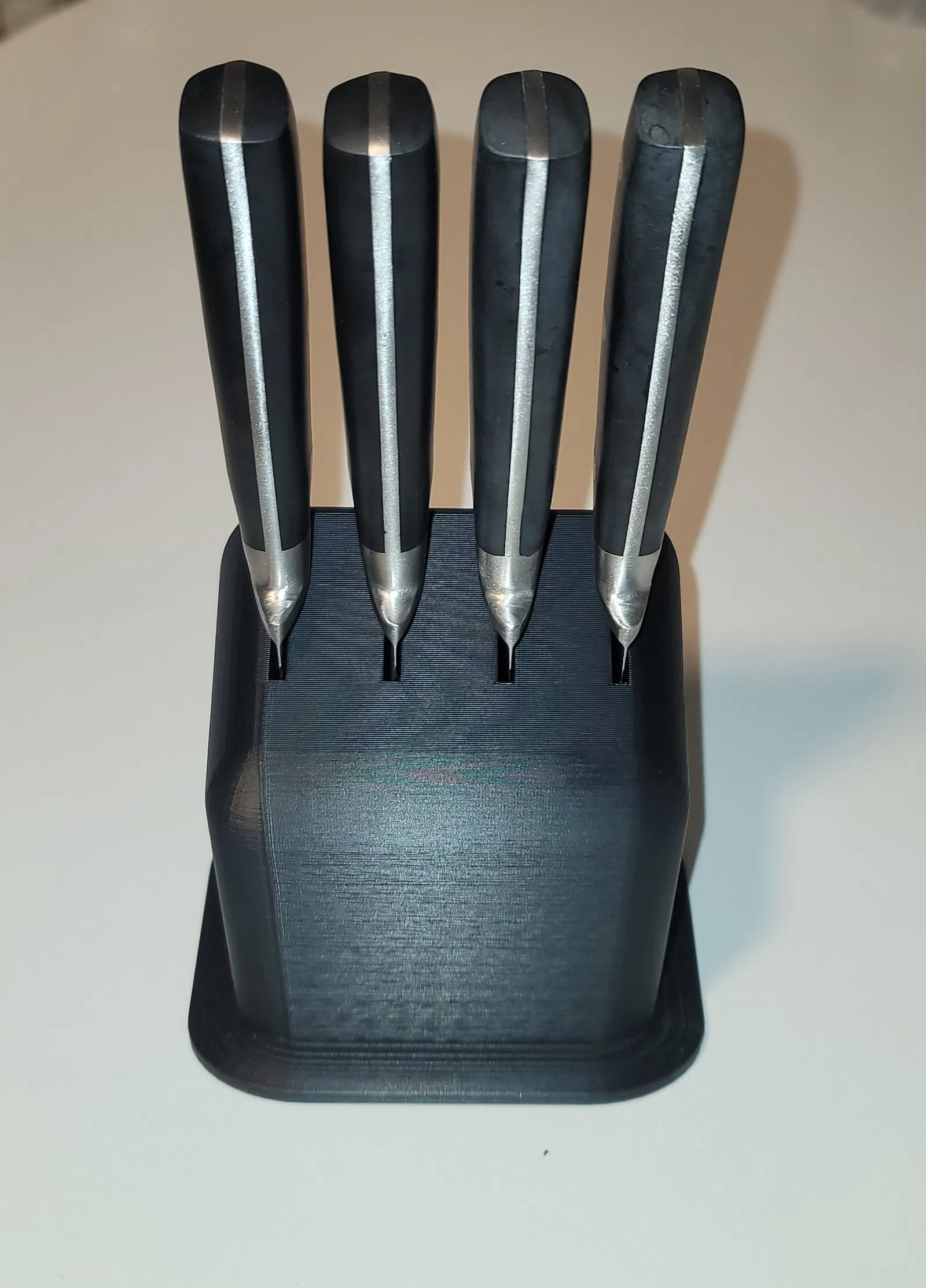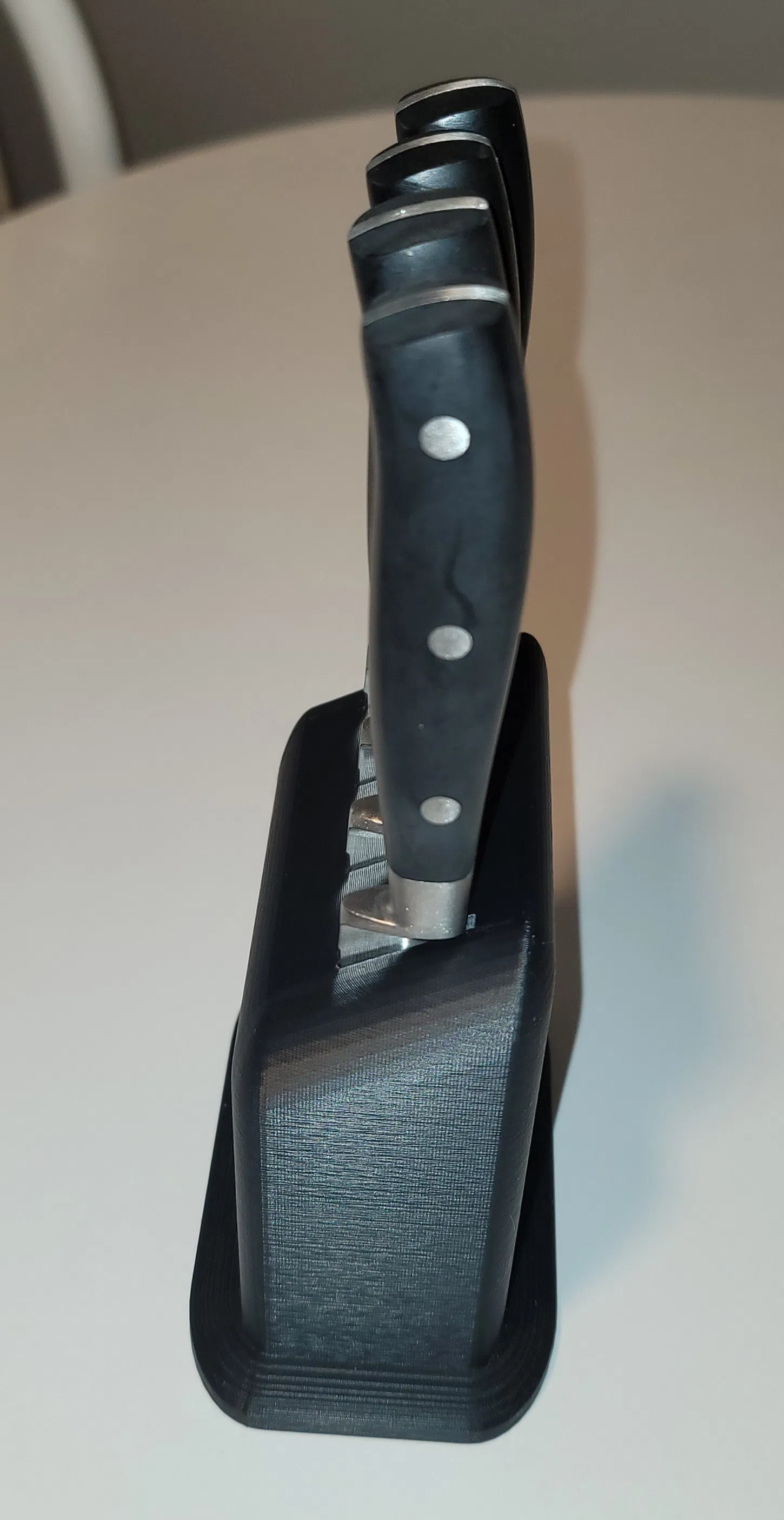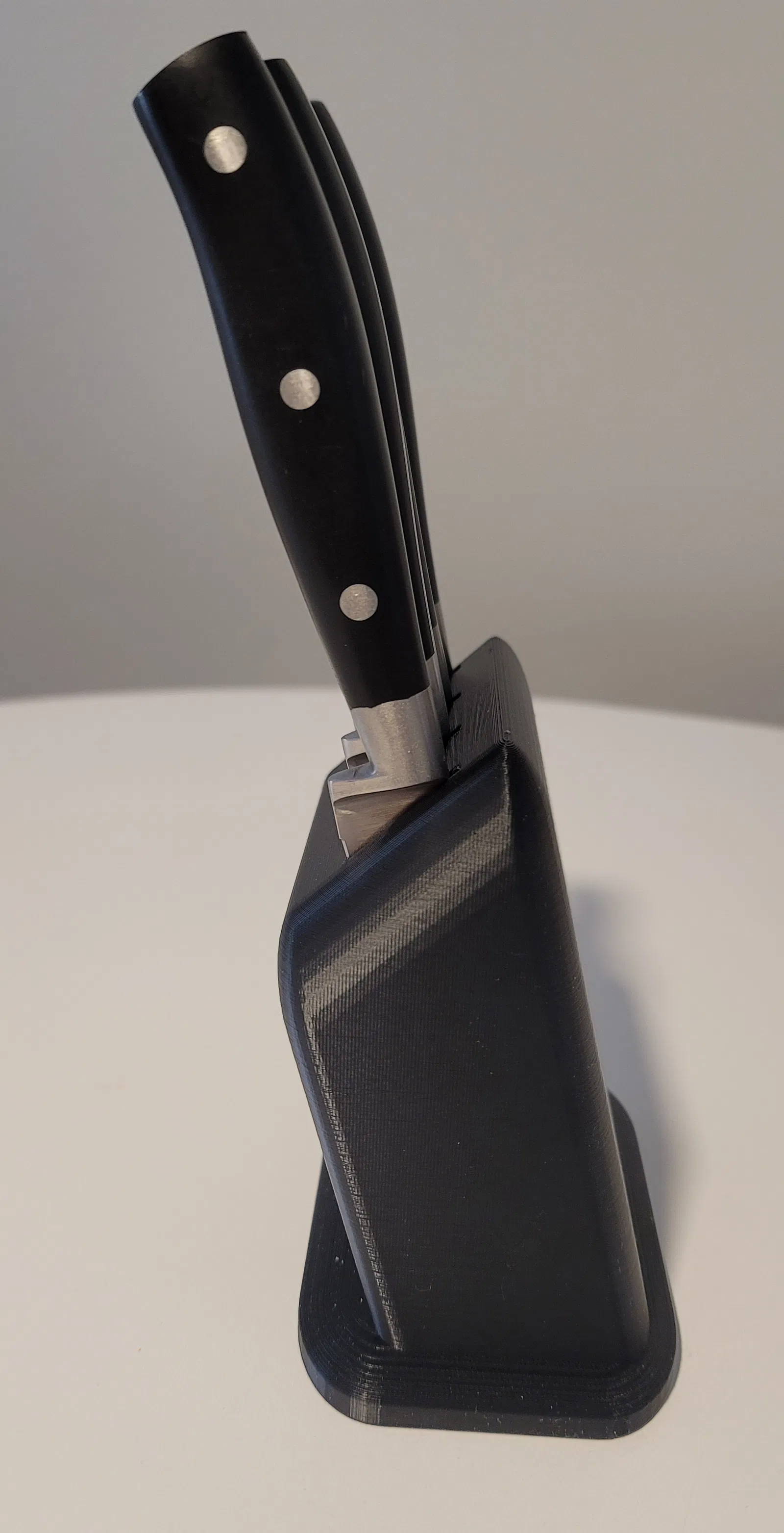 Không muốn dao bít tết mới bị hư trong hộc tủ, nên tui đã làm cái đế đựng để trên bàn bếp. In bằng PLA, 20% infill, in 20 tiếng nhưng rất đáng. Đã có phiên bản đứng thẳng để không bị lật.