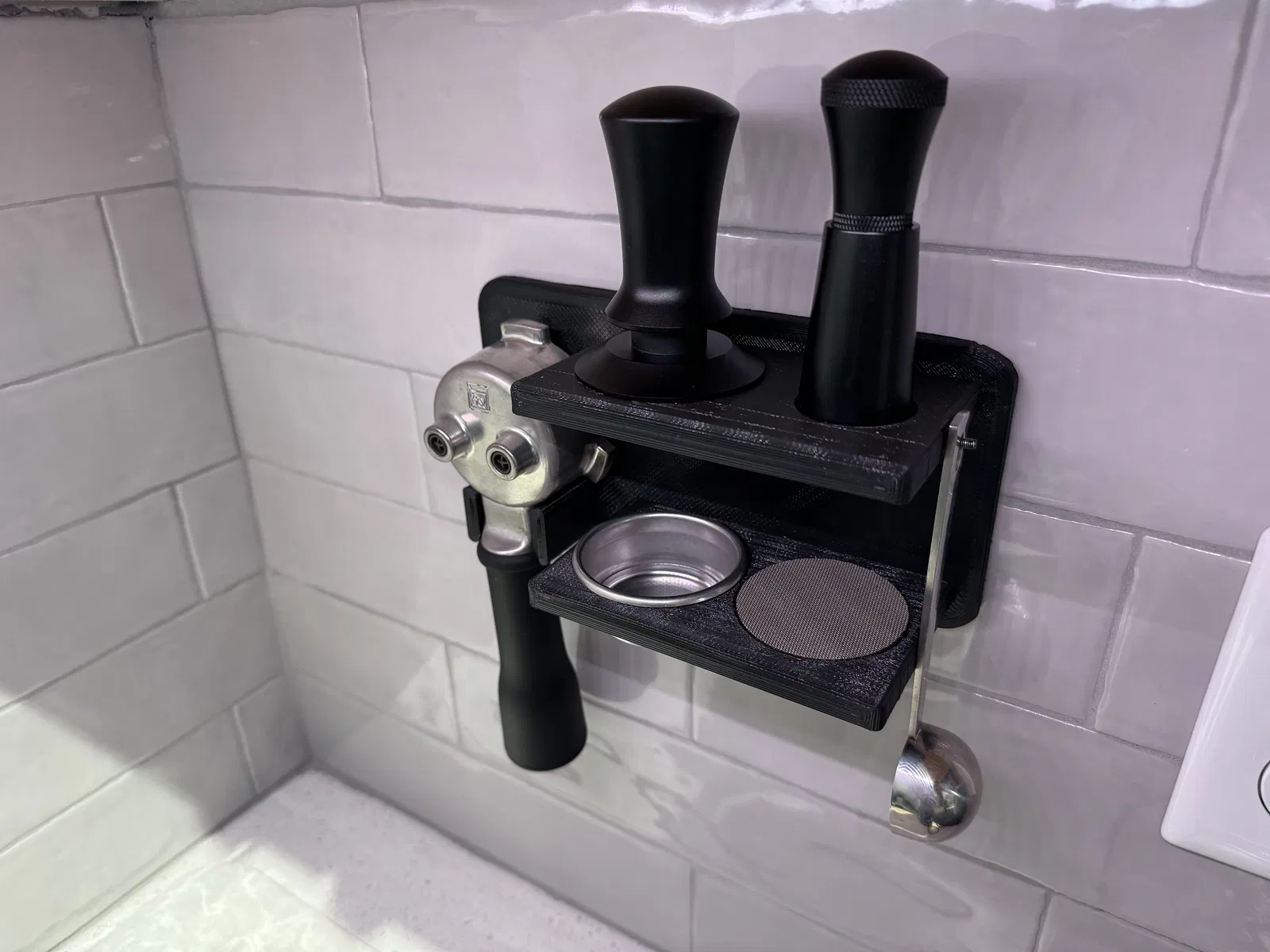 Giải pháp lưu trữ tất cả các phụ kiện espresso của bạn, bao gồm portafilter, tamper, dụng cụ phân phối, lưới lọc, muỗng và giỏ portafilter. Thiết kế thông minh, có thể gắn tường tiện lợi.