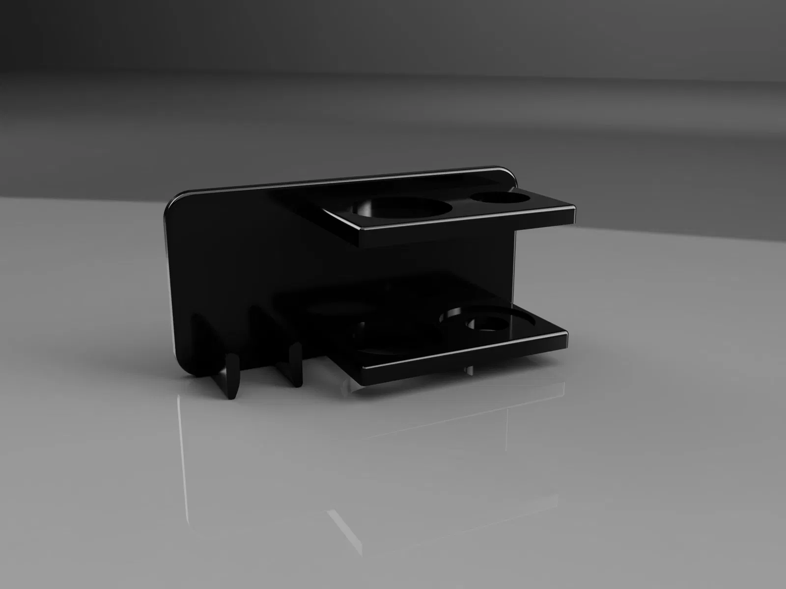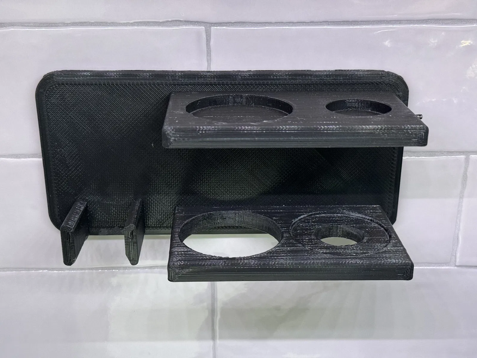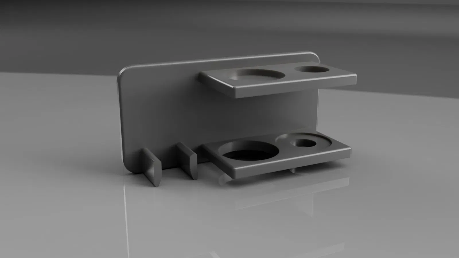 Giá đỡ phụ kiện Espresso cho portafilter Breville 54mm. Có thể để vừa cả tamper, dụng cụ phân phối espresso, lưới lọc puck, muỗng, và giỏ portafilter. Tui có gắn thêm 1 con ốc m3 để làm móc treo muỗng ở bên hông, nhưng cái này là tùy chọn nha. Mặt sau của giá đỡ cũng có chỗ để dán 2 miếng command strips để treo tường.