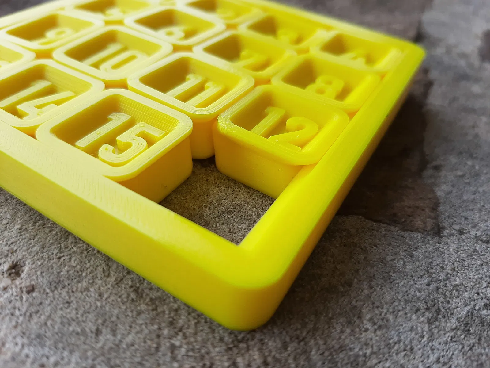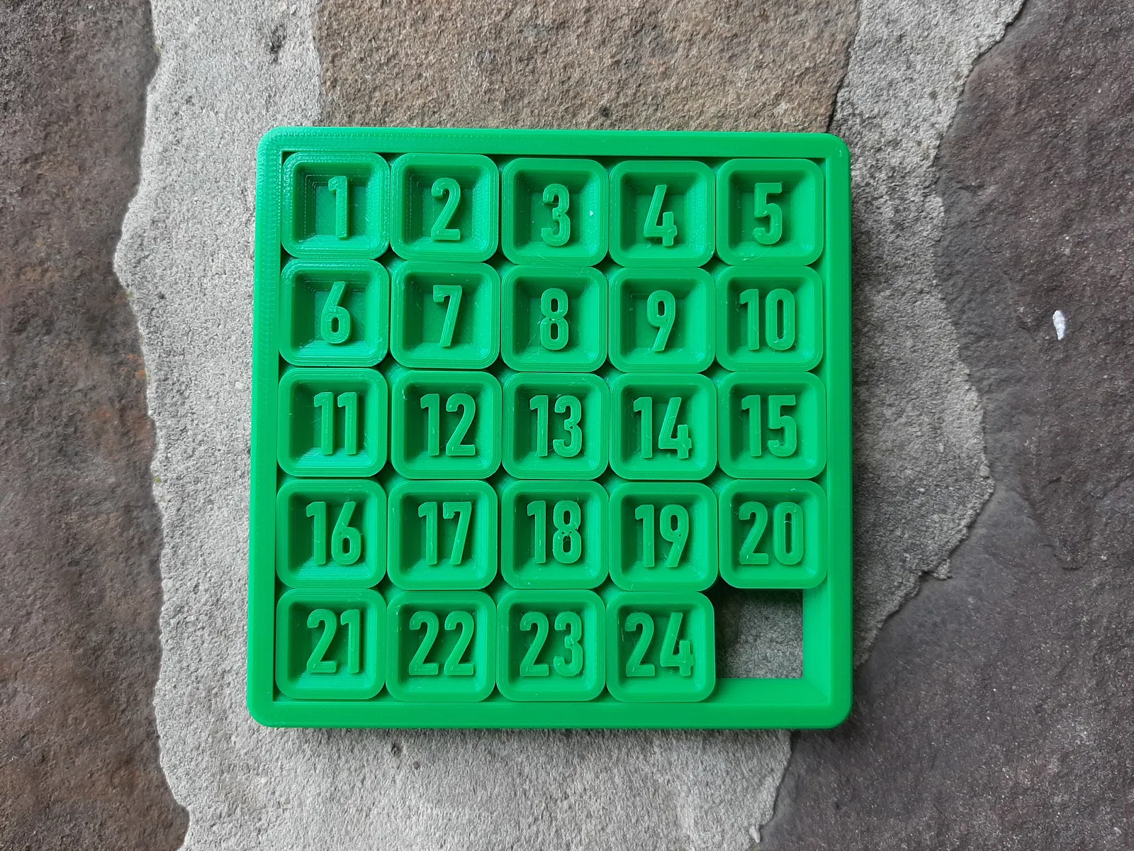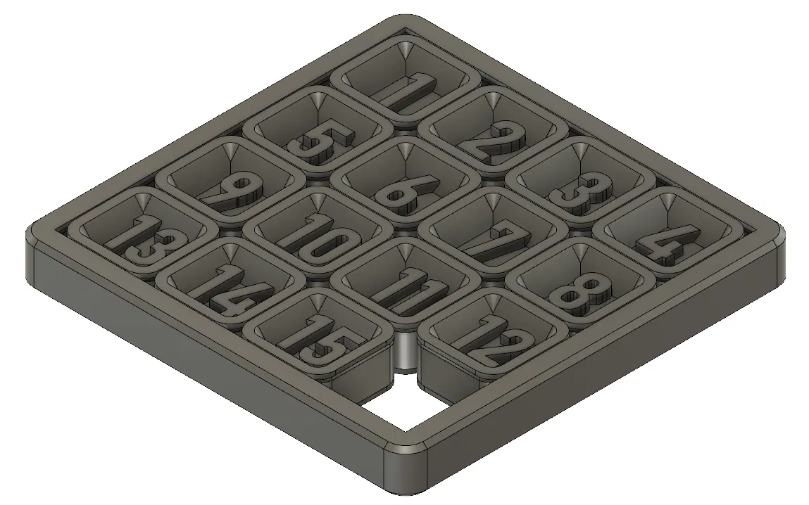 Phiên bản in 3D của trò chơi xếp số trượt kinh điển 15 ô. Có cả bản 8 ô và 24 ô. Các bộ phận in dính với nhau, yêu cầu máy in chính xác. Có thể tùy chỉnh kích thước và độ hở qua file Fusion.