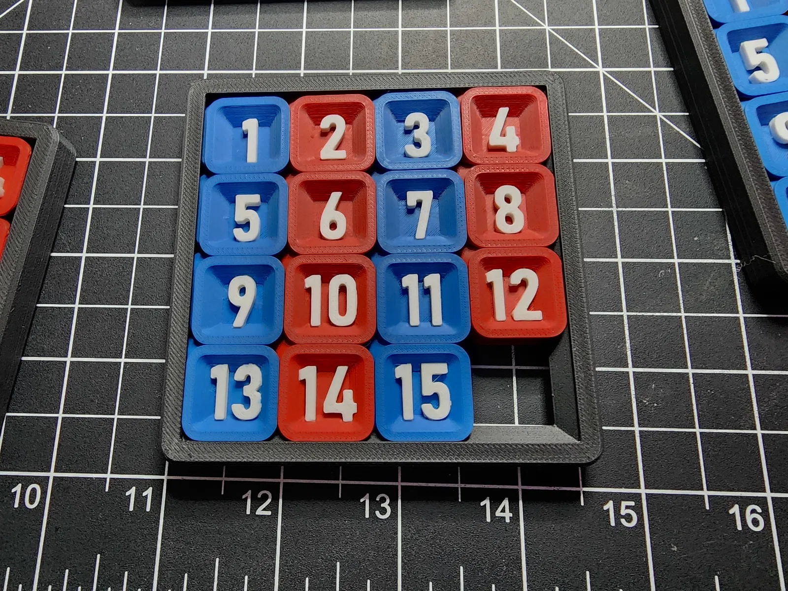 Mình đã lấy bộ xếp hình 15 số từ "Print in Place Sliding Number Puzzle" của zcassell và tạo ra hai phiên bản. Một phiên bản 4 màu với các màu khác nhau cho vành, các số chẵn, các số lẻ và các con số. Phiên bản 3 màu với các màu khác nhau cho vành, các số chẵn và lẻ, và màu sắc của các con số bị đảo ngược.