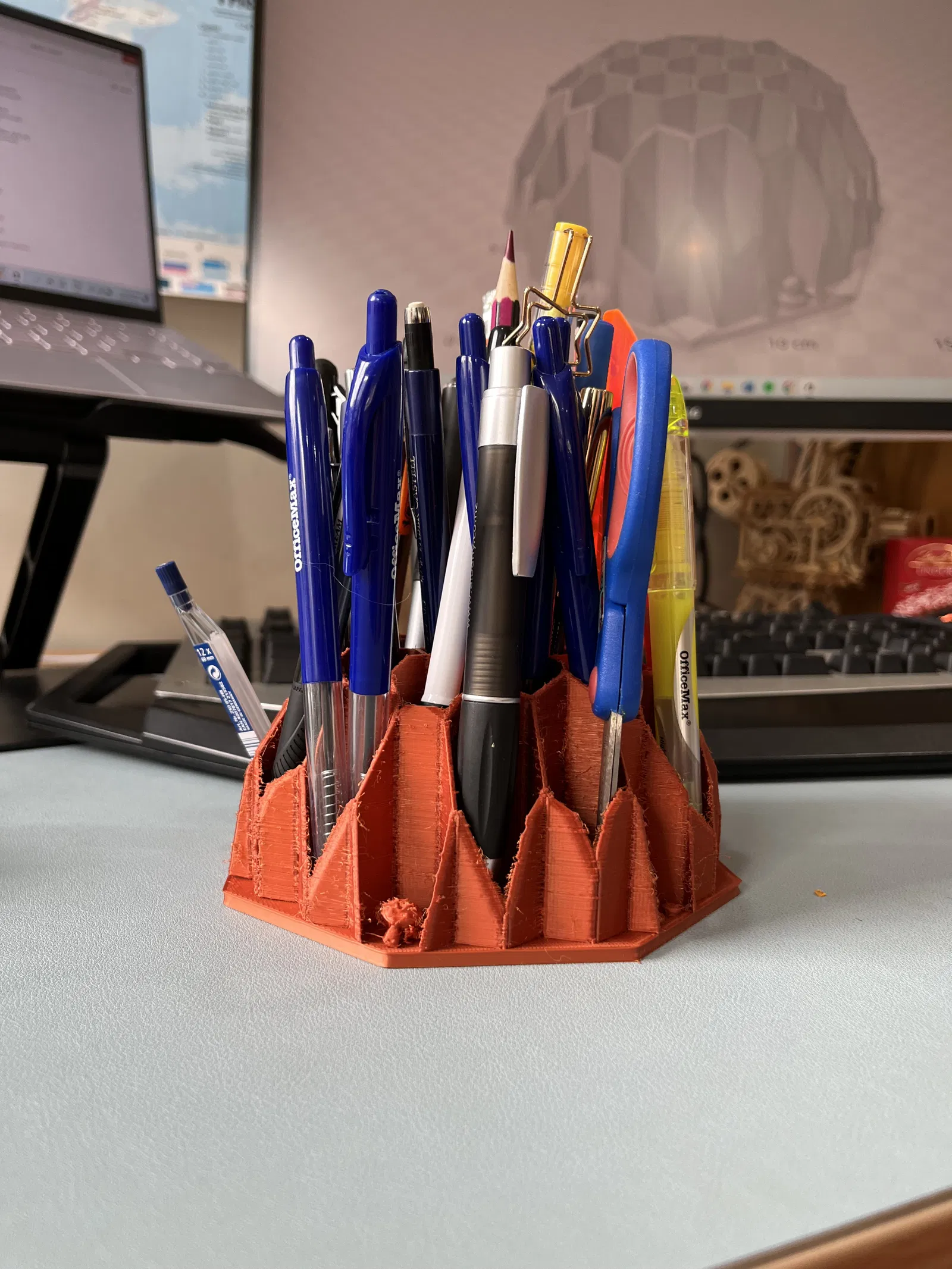 Chỗ cắm viết với họa tiết lục giác, kèm theo mini benchy, khỉ, vịt cao su và ba đế lego minifigure. Một chỗ cắm viết nhỏ xinh, để được 27 cây viết và dụng cụ học tập.