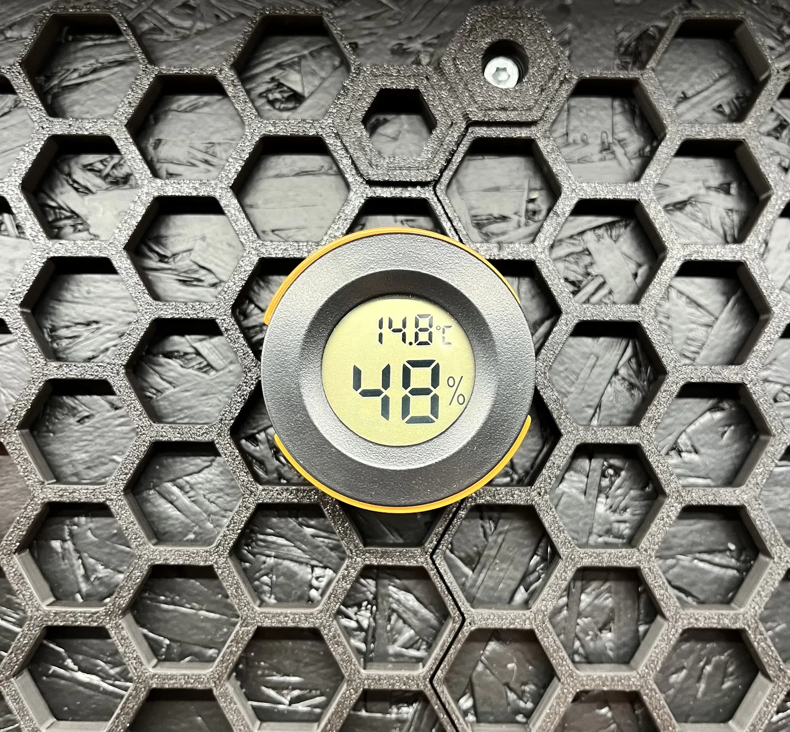 Cái đế giữ nhiệt kế kỹ thuật số và ẩm kế tròn, nhúng vừa cho Tường lưu trữ dạng tổ ong Honeycomb Storage Wall (HSW). Bạn có thể tìm thấy nó trên aliexpress bằng cách tìm kiếm "Circular Embedded Digital Thermometer", "Mini Digital Round Hygrometer Thermometer" và các từ khóa khác.