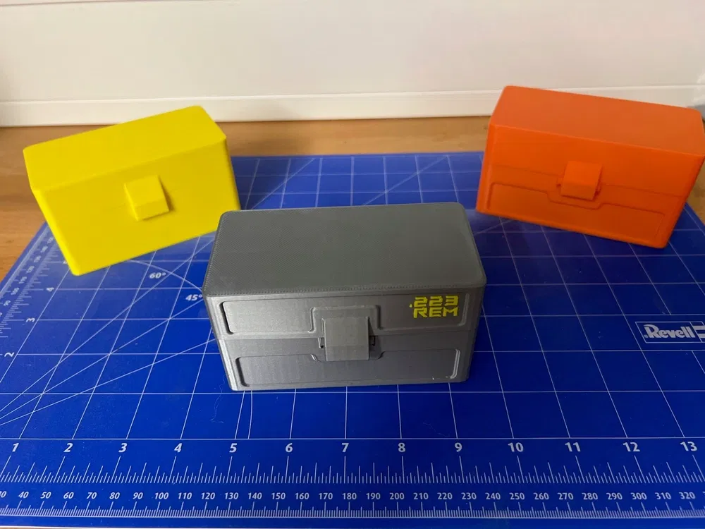 Hộp đựng 50 viên đạn .223 REM, có sẵn nhãn .223 REM. Người dùng khuyên nên in với hỗ trợ dạng cây (tree support) và đặt trên bàn máy in.