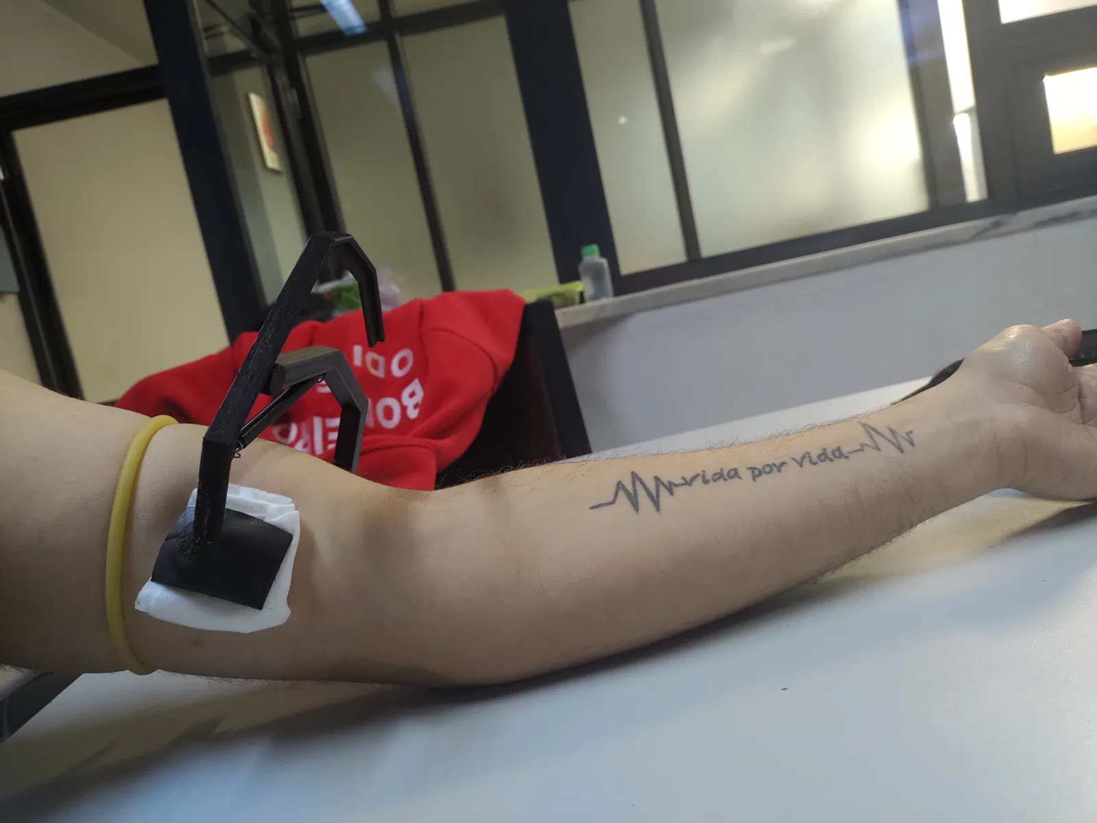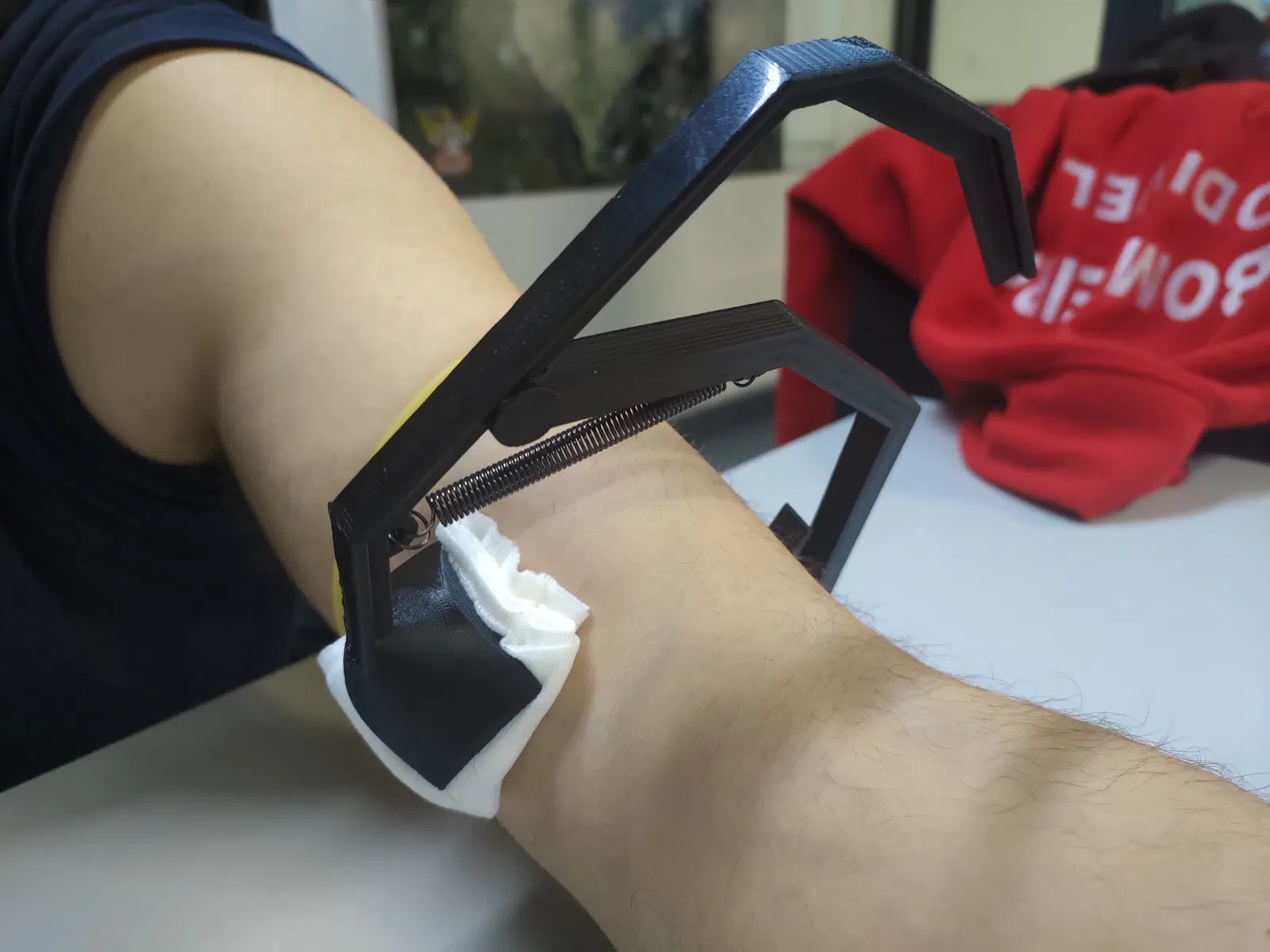 Đây là mô hình 3D và bản in của kẹp cánh tay fistula, một thiết bị y tế dùng để tạo áp lực lên lỗ rò và cầm máu. Thiết bị này dùng để tạm thời chặn lưu lượng máu trong các thủ thuật mạch máu, như tạo lỗ rò động mạch hoặc ghép mạch máu cho lọc máu.