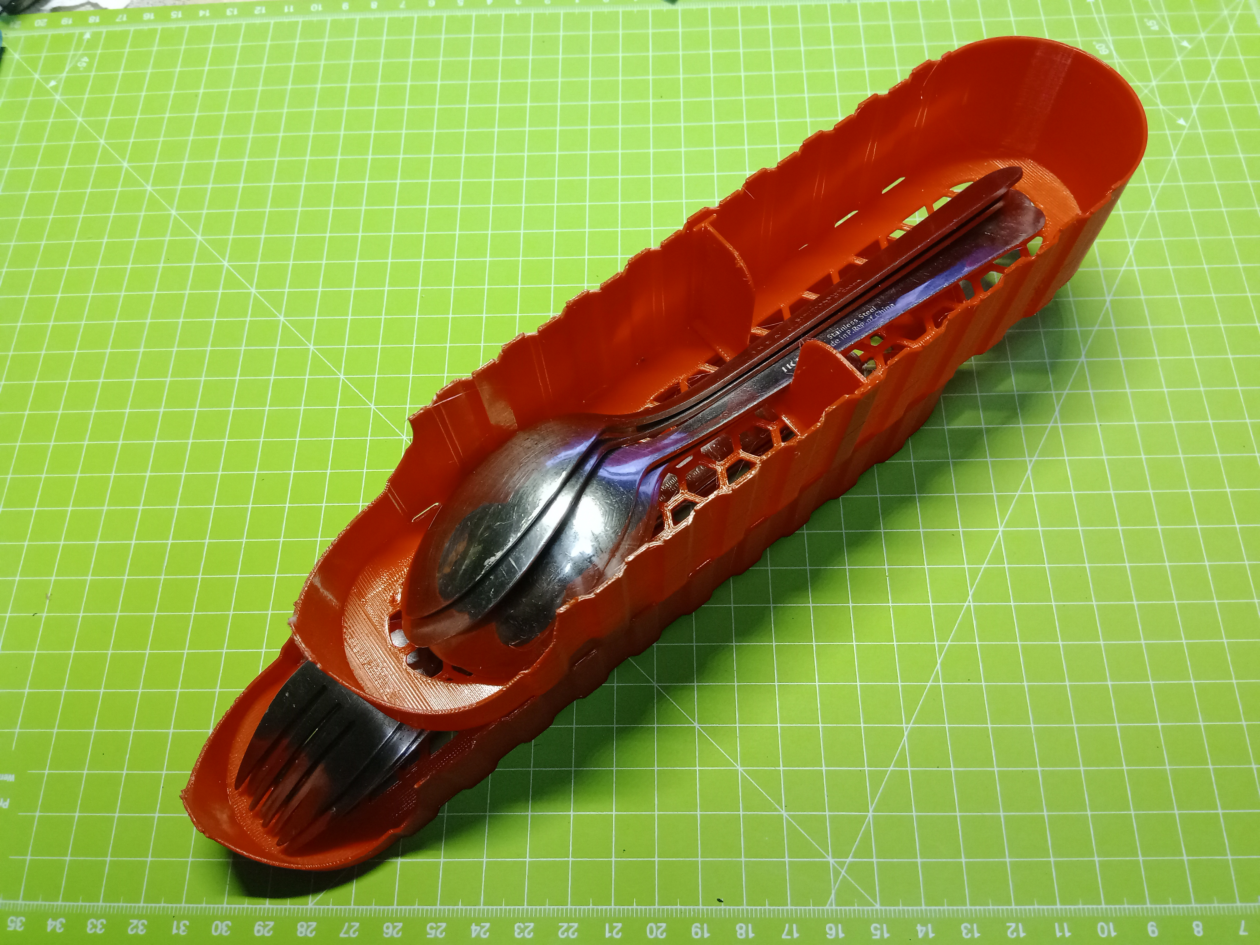 Một khay đựng dao nĩa trông đơn giản. Phần trên và dưới có giao diện cho phép các khay lồng vào nhau và đặt chồng lên nhau một cách đáng tin cậy. Ngoài ra còn có một tấm chèn (tùy chọn) để giữ cho dụng cụ của bạn ở giữa khay.