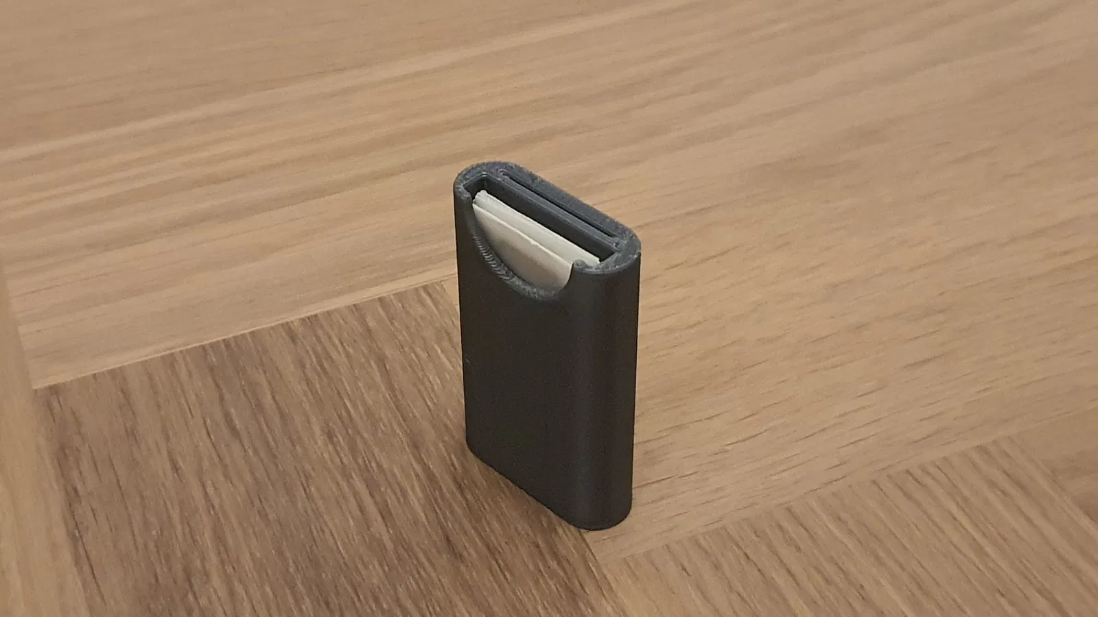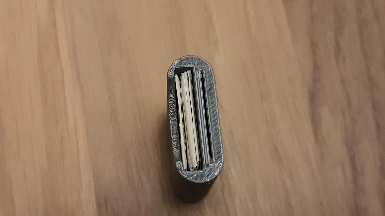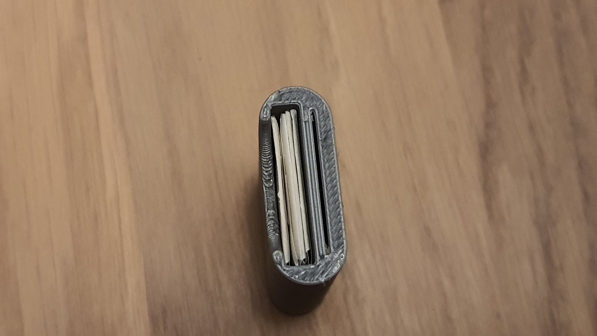 Nó cũng có một giá đỡ cho tối đa năm lưỡi dao mới. Giá đỡ này có một ngăn thứ hai, có thể giữ an toàn năm lưỡi dao đã sử dụng, để các lưỡi dao cũ có thể được vứt bỏ an toàn. Để giảm thiểu rác thải, hãy in giá đỡ với một viền, nó vẫn đủ mạnh.