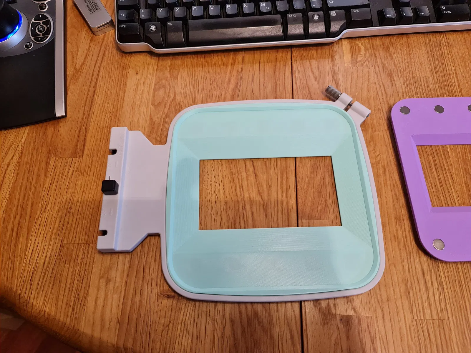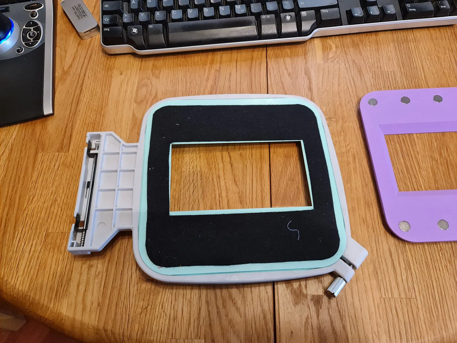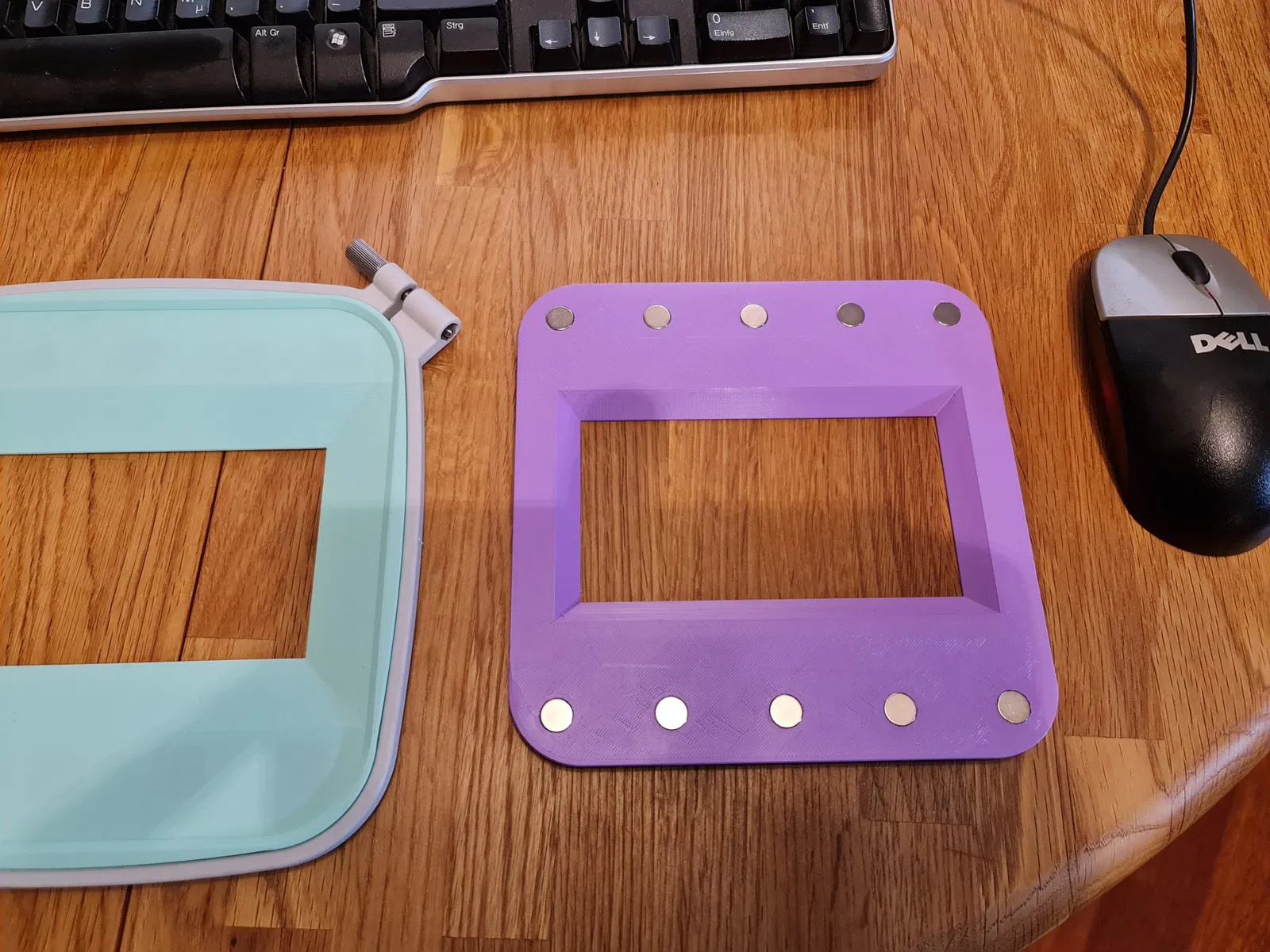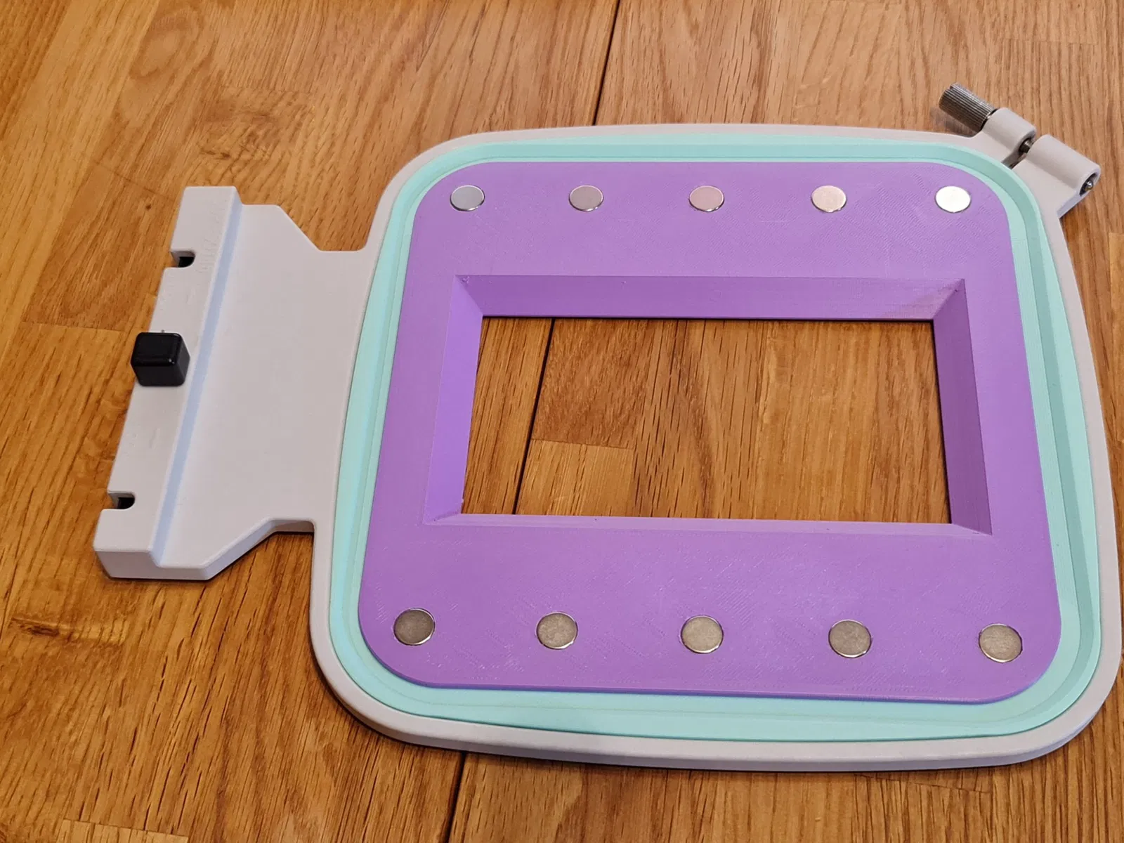 Vải được giữ cố định bằng một tấm kẹp và không bị kéo căng quá mức. Các nam châm được lắp vào tấm trên và tấm dưới để giữ mọi thứ lại với nhau.