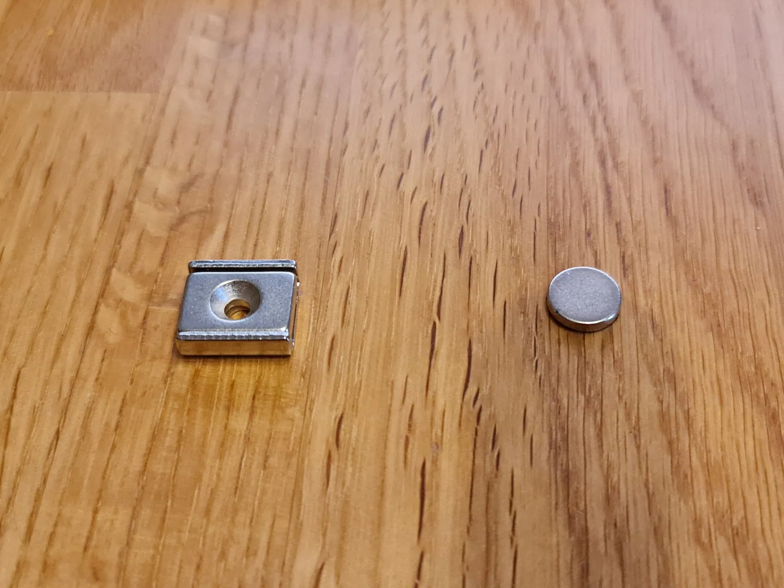 Bạn sẽ cần 10 nam châm neodymium Ø10x2 và 10 nam châm chậu neodymium 15x13,5x5mm. Các nam châm chậu được lắp vào tấm dưới (nam châm phải hướng vào tấm). Các nam châm tròn được lắp vào tấm trên. Đảm bảo rằng cực tính đúng để nam châm có thể hút các nam châm chậu ở dưới.