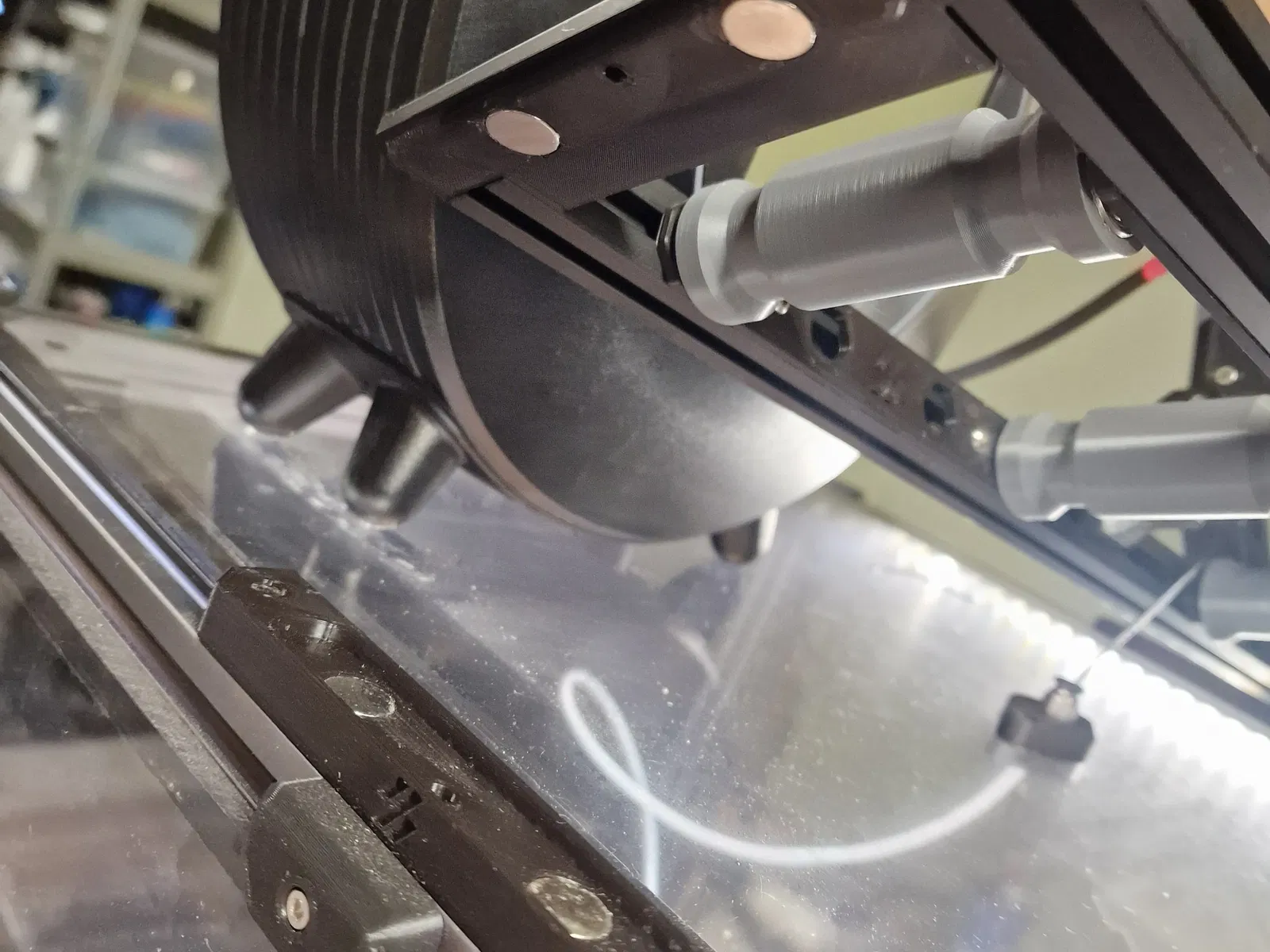 Tôi có hai thanh nhôm 2020 dự phòng và muốn tạo một thiết lập để loại bỏ trọng lượng cuộn filament khỏi tấm trên cùng. Khung được gắn vào khung chính bằng các giá đỡ và nam châm.