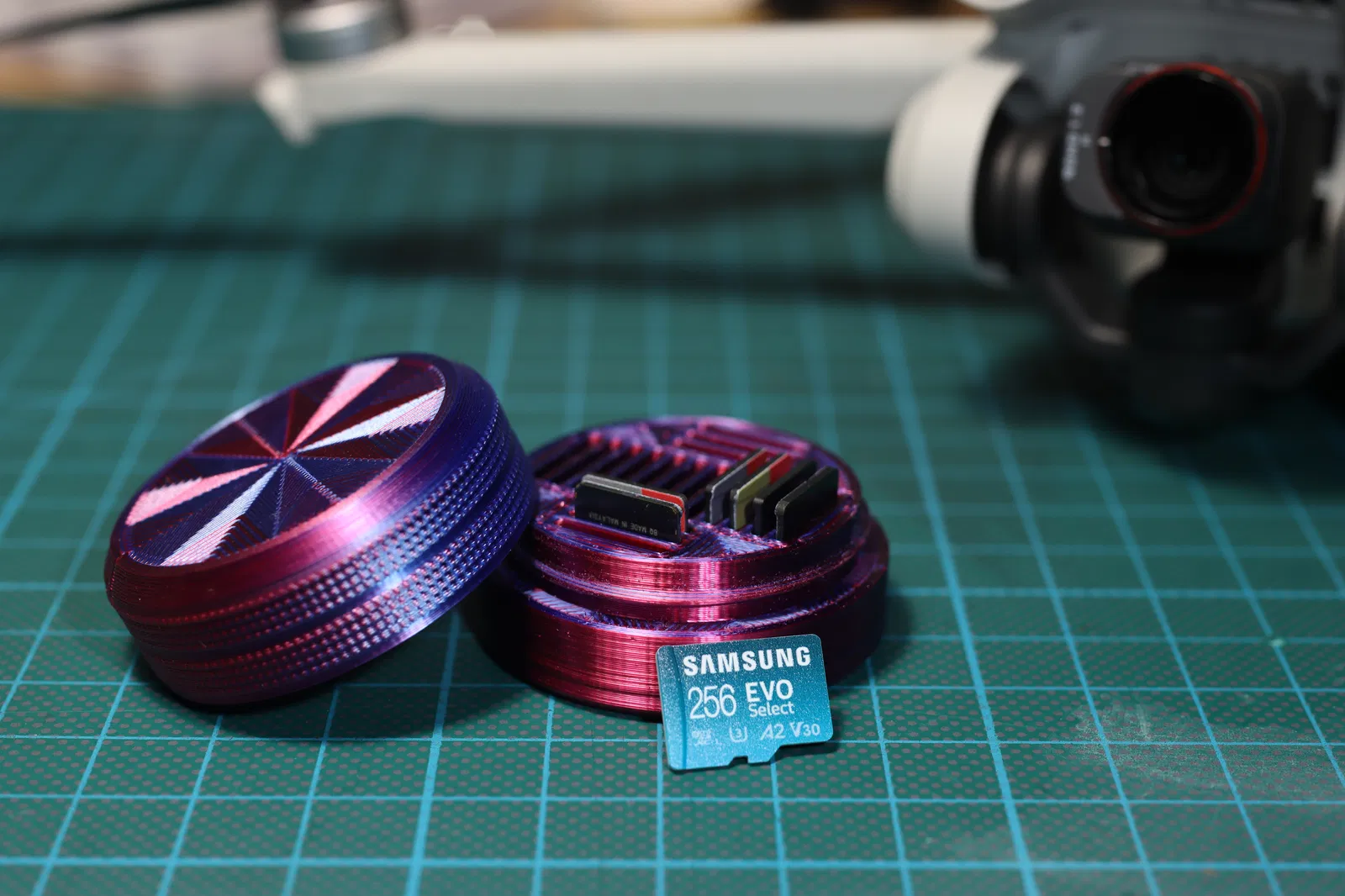 Đây là một cái hộp đựng thẻ micro-SD, có thể chứa tới 18 thẻ. Một nơi an toàn cho rất nhiều dữ liệu ;-) Đây là phiên bản nhỏ hơn của hộp đựng thẻ SD phổ biến của mình: Sau khi in xong, bạn nên vặn nắp và thân hộp ra vào vài lần, đồng thời lau sạch ren bằng khăn giấy vài lần để mài ren và giúp nó xoay trơn tru hơn. Vặn càng lâu thì càng trơn.