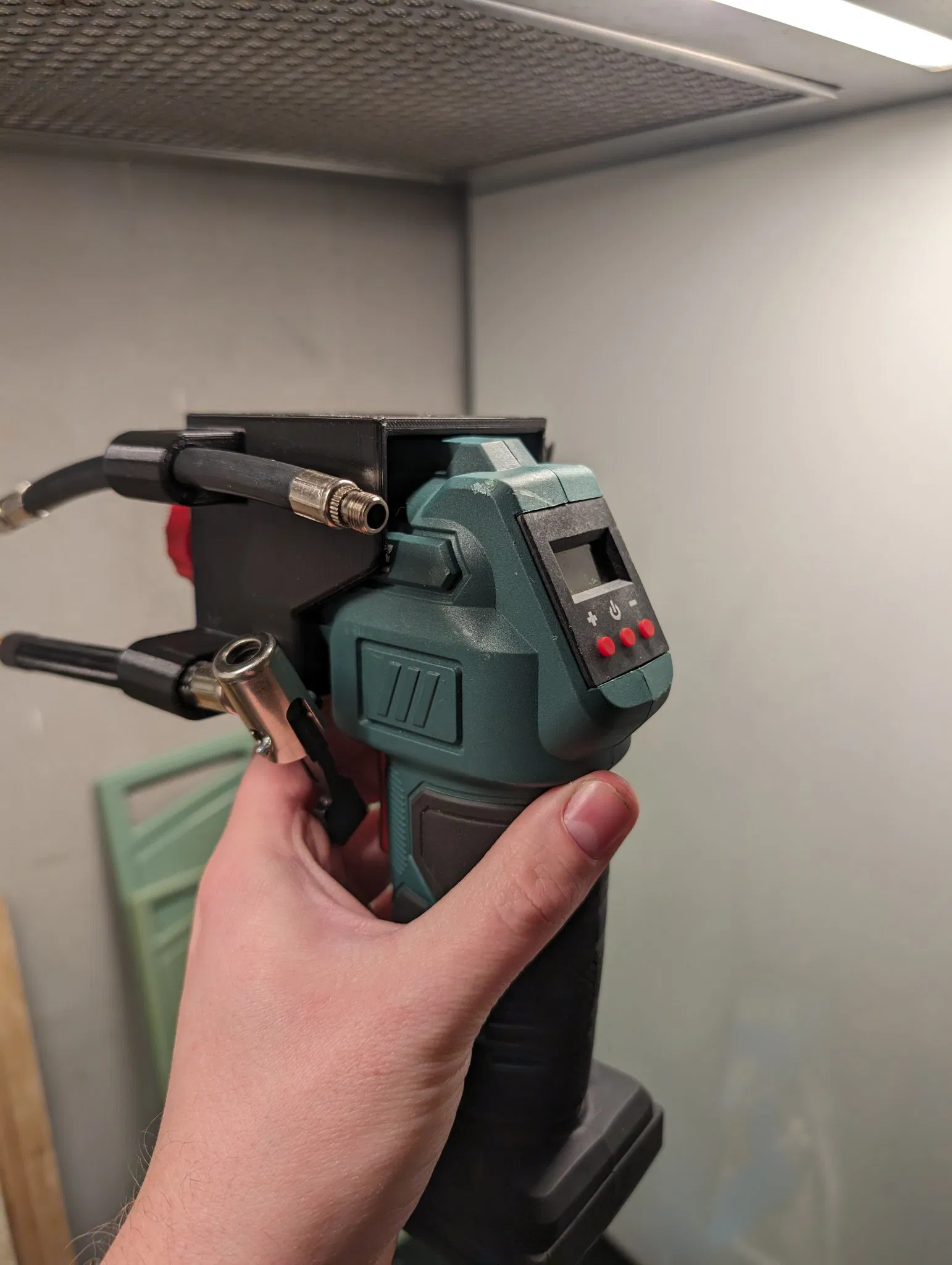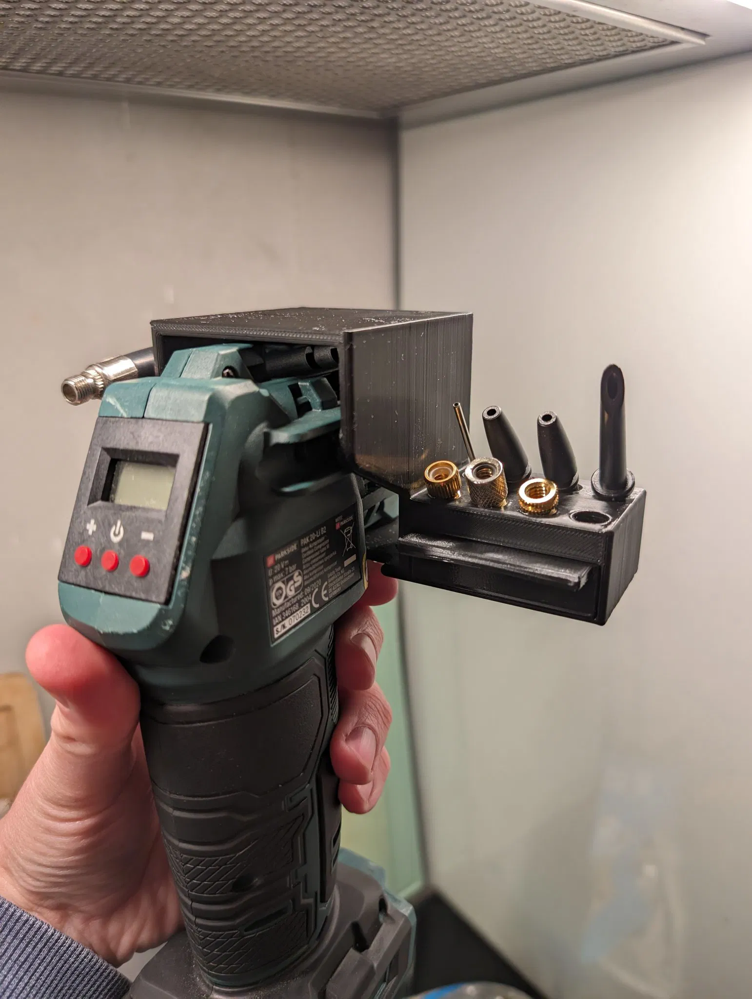 Giá đỡ đơn giản dưới cùng cho máy nén khí cầm tay Parkside với tất cả các phụ kiện gốc của nó, ống bơm xe điện Xiaomi và ngăn kéo cho van và nắp.