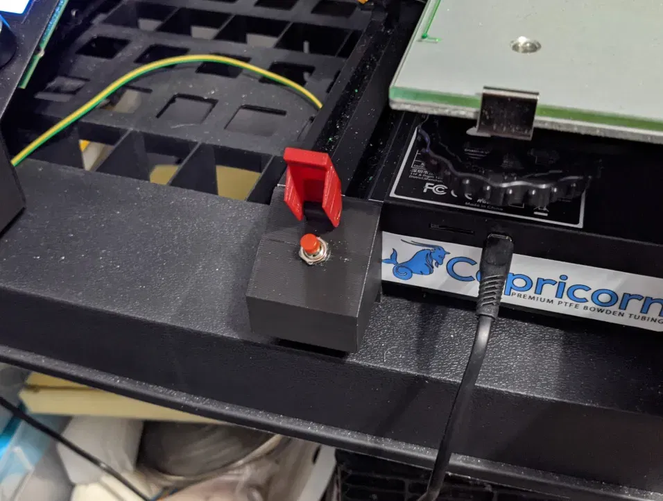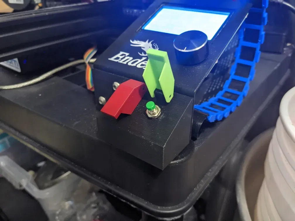 Đây là một hộp nhỏ chứa 2 nút nhấn, có nắp. Cơ sở có thể được gắn ở phía trước bên phải của một Ender 3 (pro), ngay trước LCD, bằng cách sử dụng 2 vít hiện có ở cuối ray 40x40.