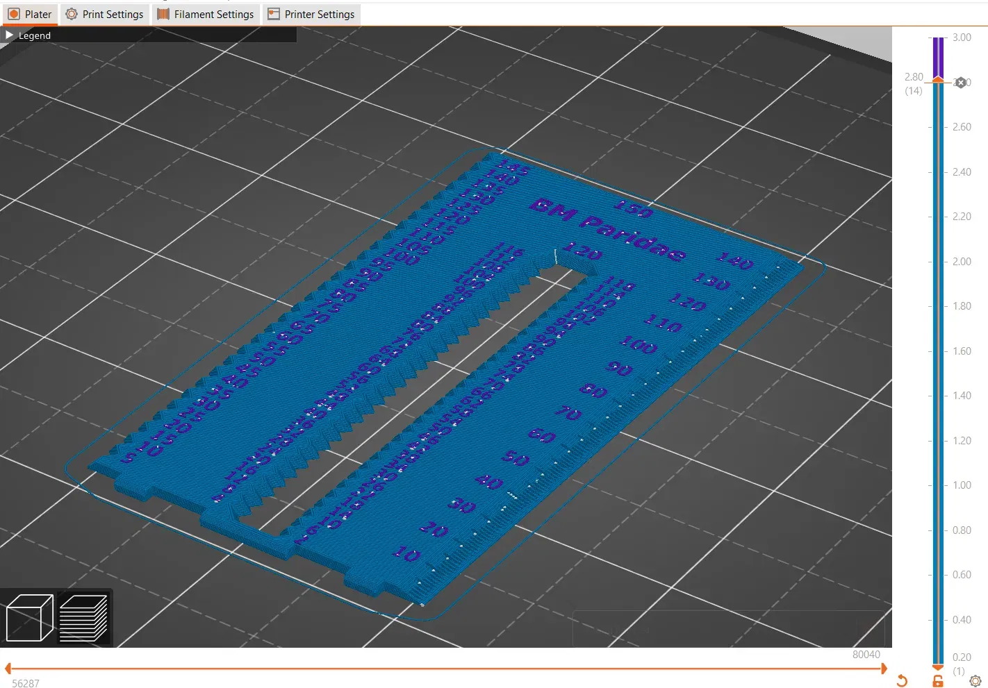 Thước được in phẳng trên giường. Điều này cho phép thay đổi filament theo kế hoạch để in các số bằng màu khác.