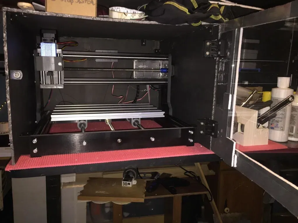 Tôi đã có một máy CNC foxalien 3018 pro cho máy router CNC đầu tiên của mình nhưng tôi chưa bao giờ có thể hoàn thành một công việc, nó sẽ dừng lại giữa chừng và tôi không bao giờ tìm ra lý do nên tôi đã gửi lại và thay vì chỉ nhận một cái thay thế, tôi đã nhận được một cái đi kèm với laser 7.5w nên giá cao hơn một chút nhưng không đi kèm với vỏ acrylic đẹp mà tôi đã chú ý đến cách họ làm vỏ và tôi đã cải tạo tất cả các bộ phận. Tôi không có acrylic để lắp ráp nên tôi đã chọn sử dụng bảng foam dày 5mm mà bạn có thể mua từ các cửa hàng đồng giá và nó hoạt động cũng tốt. Tôi đã làm một số acrylic cho cánh cửa và dự định thêm nó vào phần trên để bạn có thể nhìn thấy bên trong một chút, nó hoạt động hoàn hảo để giữ bụi lại và giữ cho laser được che phủ để không làm mù ai đó khi bước vào phòng của tôi. Những cái này được làm giống như foxalien và nó lắp ráp giống như cái của họ. Đối với bản lề cửa, tôi đã tìm thấy một cái trên thingiverse và đã sử dụng nó, tôi đã bao gồm nó nhưng không thể tìm thấy để chia sẻ liên kết nhưng sẽ thêm nó như một cập nhật khi tôi tìm thấy. Tôi không còn sử dụng cái này cho vỏ của máy router CNC của mình vì tôi đã thay đổi mọi thứ và tìm thấy cái gì đó hoạt động tốt hơn cho tôi nhưng nếu bạn muốn cái nhìn sạch sẽ mà foxalien có thì hãy lấy một ít acrylic đen và trong suốt và những thứ này sẽ giúp bạn làm điều đó.