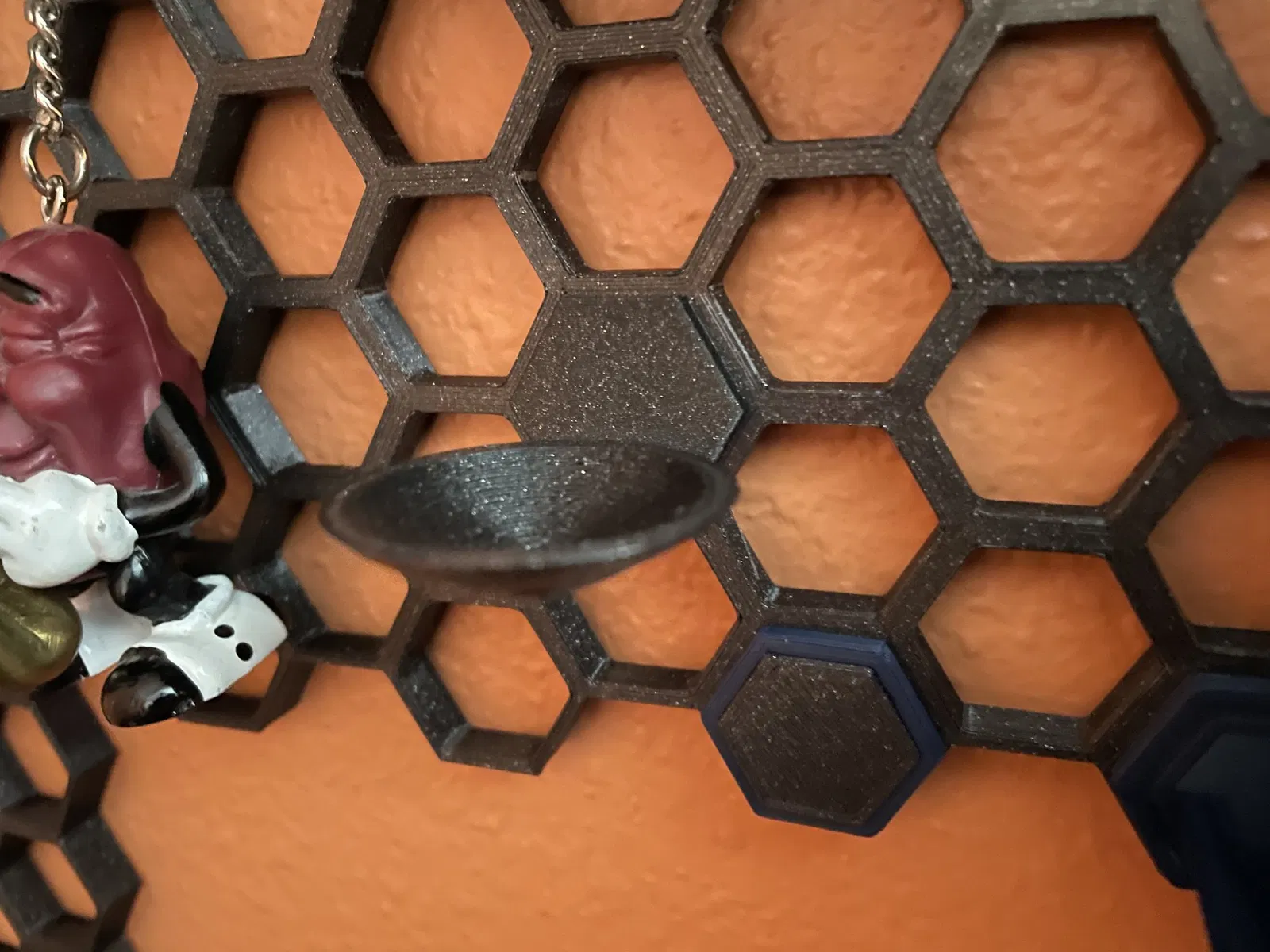 Tôi đã quyết định xây dựng một Bức Tường Tổ Ong, ban đầu để trưng bày ly uống trên các kệ đi kèm. Tôi có một số quả bóng golf lưu niệm mà tôi nghĩ sẽ hoàn hảo để lấp đầy một số khoảng trống trên bức tường của mình, vì vậy tôi đã chỉnh sửa cái móc dài nhỏ thành một giá đỡ bóng golf!