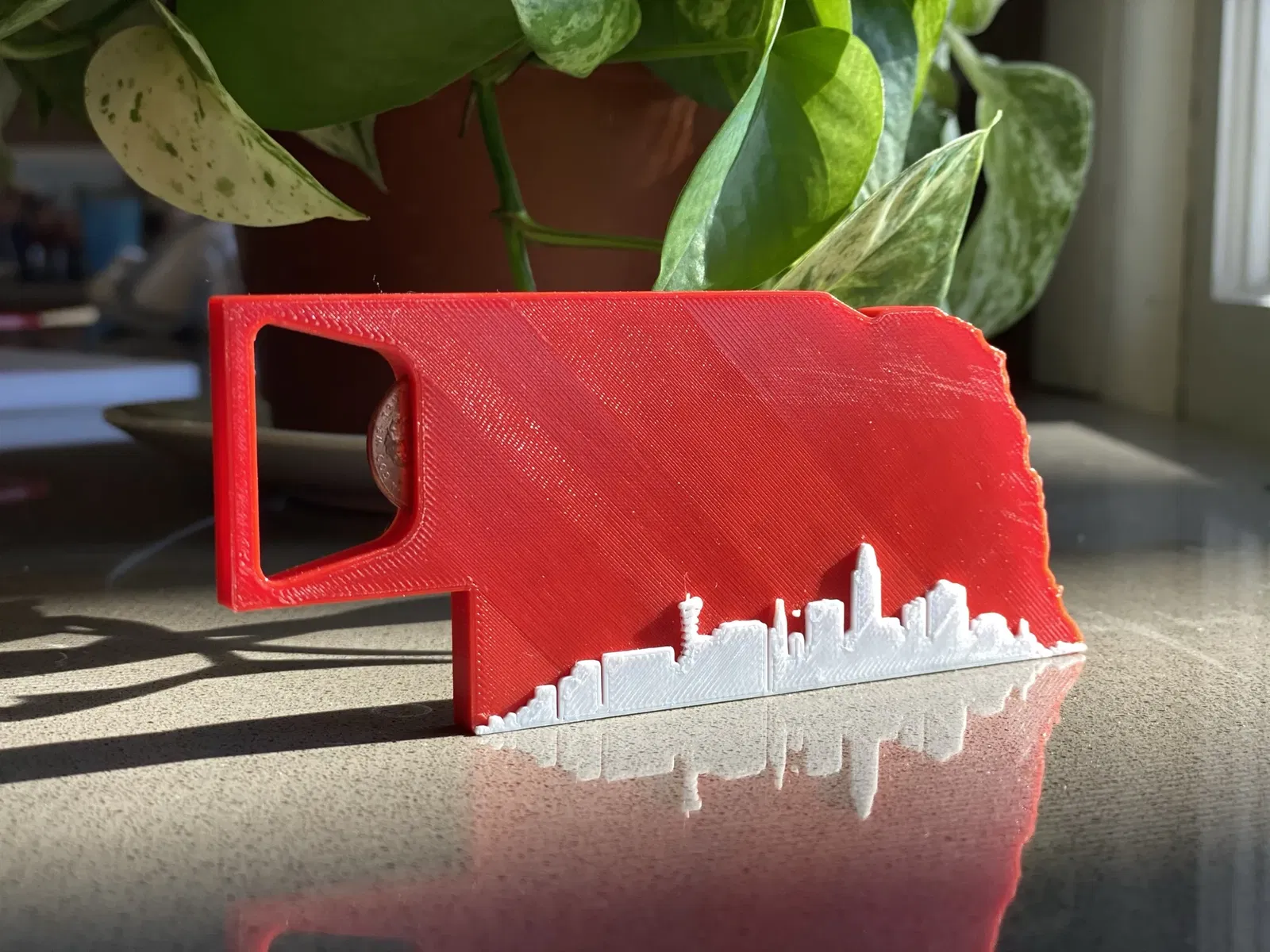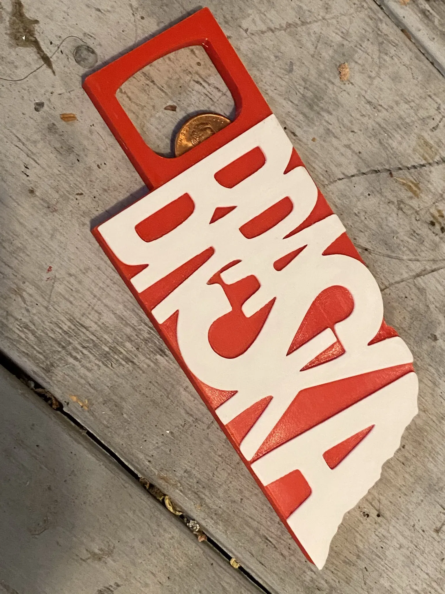 Cái mở chai này dựa trên tiểu bang Nebraska sử dụng một đồng xu Mỹ (chơi chữ cho Lincoln, NE) làm dụng cụ mở. Tôi có một vài mẫu có và không có khoảng trống cho nam châm (dựa trên nam châm neodymium tròn 10x2mm).