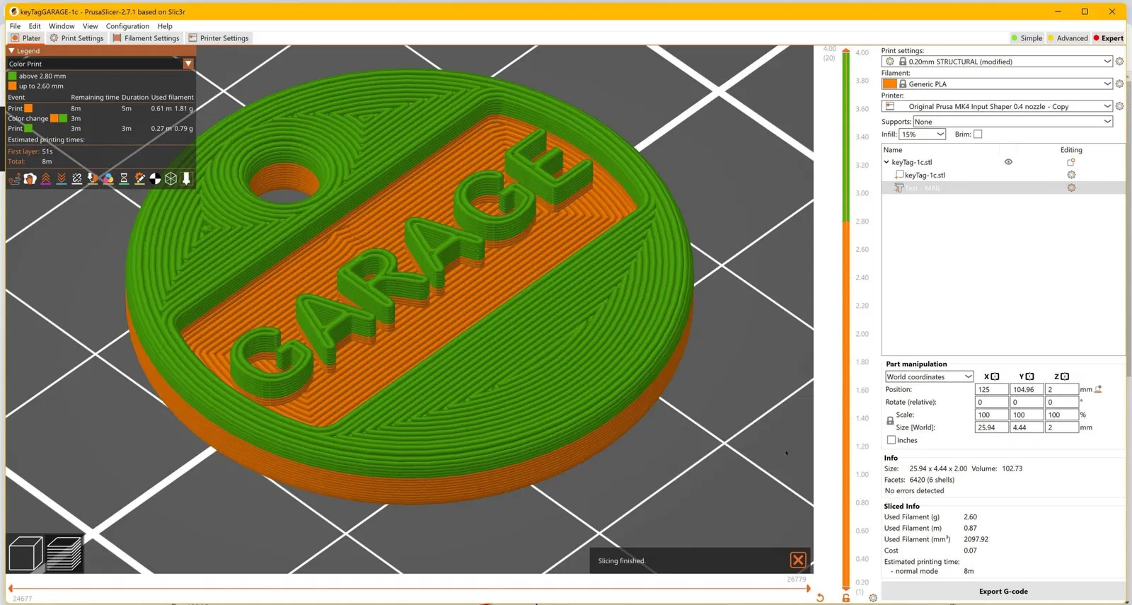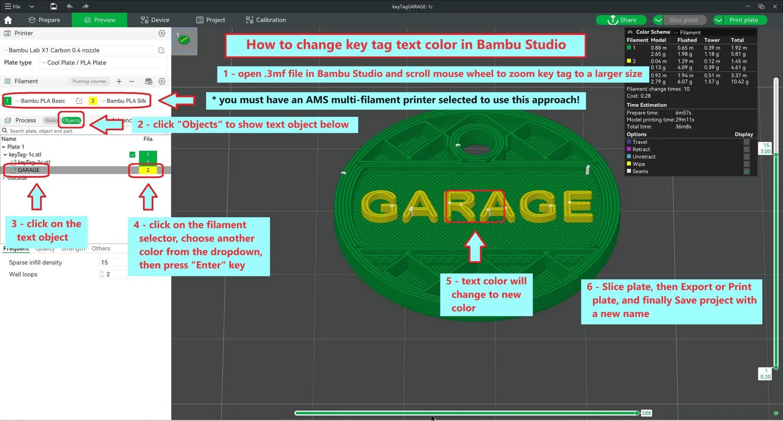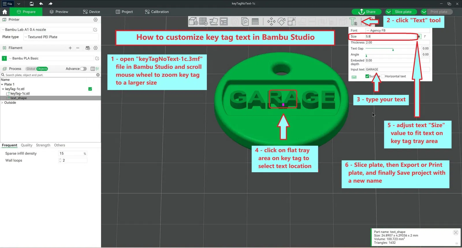 Tôi đã tạo ra Thẻ Chìa Khóa này như một cách đơn giản để gán nhãn chìa khóa bằng văn bản và mã màu. Nó in nhanh chóng và có thể được in bằng một màu hoặc hai màu (thông qua việc thay đổi màu trong slicer của bạn). Văn bản không có trong tệp STL hoặc STEP - nó là một phần của tệp 3MF và có thể được chỉnh sửa và thay đổi kích thước trong slicer của bạn (hình ảnh với hướng dẫn cho eSlicer đính kèm). Cập nhật 22 THÁNG 1 NĂM 2024: Tôi đã bao gồm một tệp "keyTagNoText-1c.3mf" mà bạn có thể sao chép và chỉnh sửa trong Bambu Studio để thêm văn bản của riêng bạn. Vui lòng xem các hình ảnh mới được thêm vào để biết chi tiết về cách sử dụng slicer của bạn để in hoặc chỉnh sửa các thẻ chìa khóa này - vì có một số hạn chế nếu bạn không sử dụng eSlicer. Slicer eSlicer hỗ trợ thay đổi màu cho văn bản nhưng dường như không có cách dễ dàng để chỉnh sửa văn bản. Bambu Studio dường như không hỗ trợ thay đổi màu bằng cách sử dụng các tệp 3MF của eSlicer - mặc dù bạn có thể thay đổi màu văn bản trong Bambu Studio nếu bạn có AMS cho in nhiều màu. Để chỉnh sửa văn bản trong Bambu Studio, dường như bạn phải bắt đầu mà không có văn bản và thêm nó qua Bambu Studio. Cũng kiểm tra 204 thẻ chìa khóa được định nghĩa trước bổ sung mà tôi vừa công bố trong mô hình mới của tôi "206+ Thẻ Chìa Khóa, 2-Màu + Văn Bản Tùy Chỉnh" tại <> - - - - - - - - - Một tệp STEP được cung cấp trong trường hợp bạn muốn chỉnh sửa thiết kế. Tệp STL được cung cấp được dự định để in bằng PLA hoặc PETG (hoặc hầu như bất kỳ vật liệu nào khác) và không yêu cầu hỗ trợ. Các tệp 3MF của eSlicer được cung cấp cho văn bản chung (mà bạn chỉnh sửa trong slicer của bạn), văn bản "MAIL", và văn bản "GARAGE" cho PLA chung. Các tệp G-code được cung cấp cho Original Prusa MK4. Các Thẻ Chìa Khóa được thấy trong các bức ảnh đã được in trên một Original Prusa MK4 với FilaCube Yellow và Green PLA và PLA lụa chung sử dụng Input Shaper với vòi phun 0.4mm ở độ cao lớp CẤU TRÚC 0.2mm với 15% gyroid infill và một mẫu điền đồng tâm ở trên và dưới. Hãy chắc chắn kiểm tra các thiết kế khác của tôi - bao gồm các bìa chìa khóa đa năng và một bộ sưu tập đa dạng các phụ kiện gia đình và công cụ in 3D - trên F3D tại https://www.f3d.vn/profile/philcaruso_661446/models