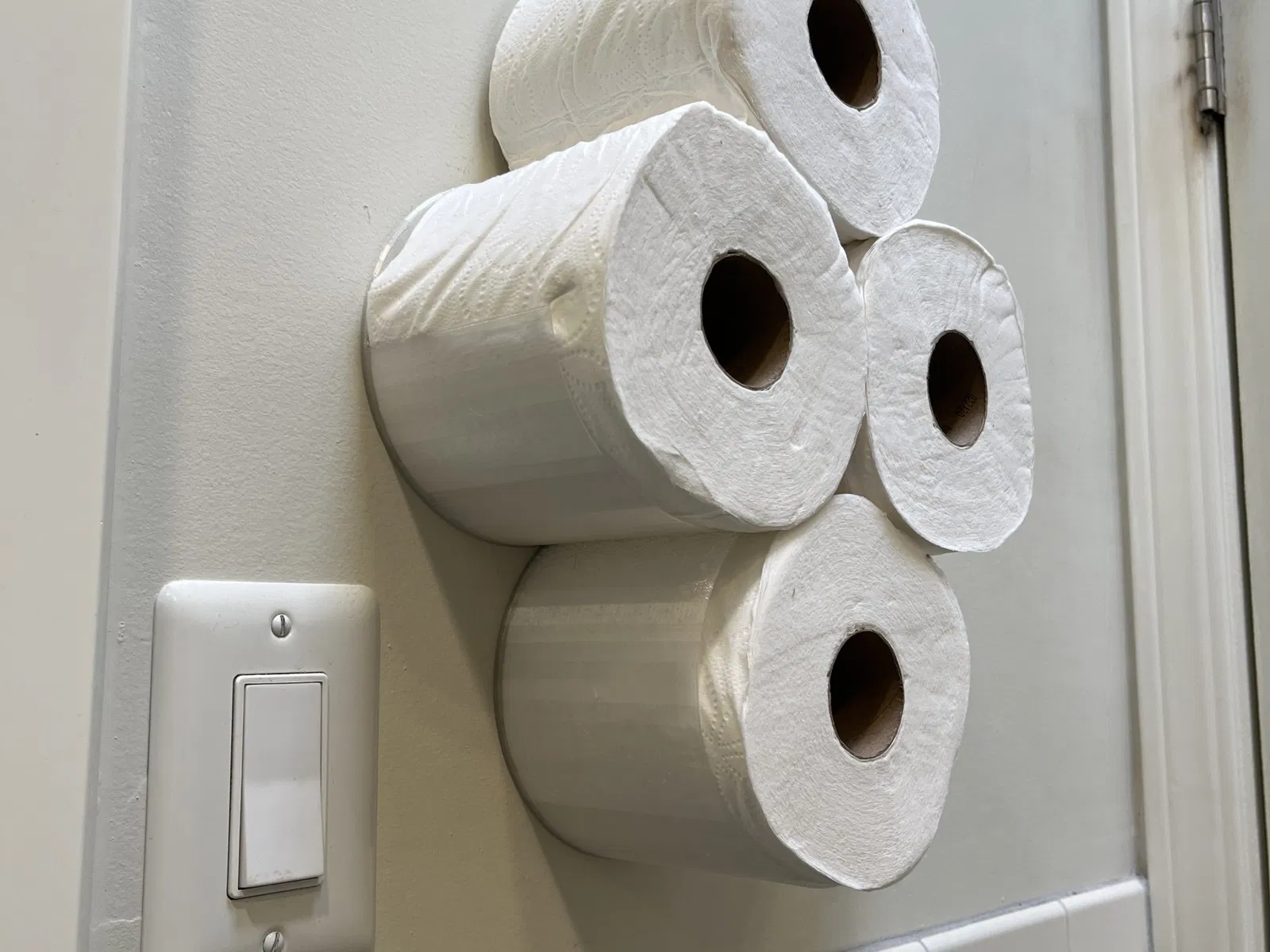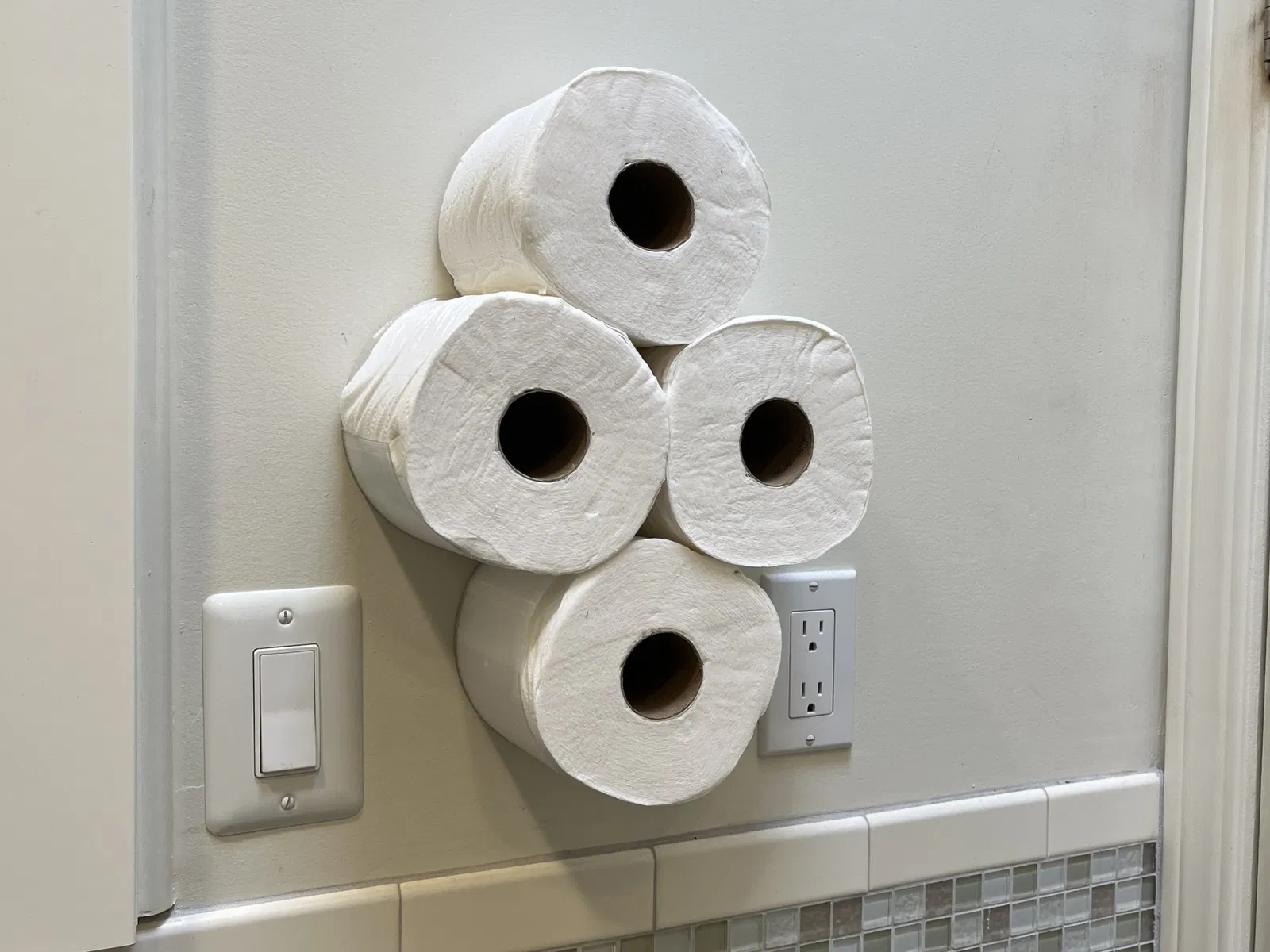 Tôi muốn đặt những cuộn giấy vệ sinh dự phòng lên tường, nhưng không thấy cái nào nhỏ gọn như tôi muốn. Tôi thích ý tưởng hình mây, nhưng có một khoảng trống giữa một vài ổ cắm mà tôi muốn lấp đầy, vì vậy tôi đã nghĩ ra một mẫu hình tam giác ngược cho ba cuộn. Cuộn thứ tư nằm trên ba cuộn kia. Điều này được thiết kế cho những cuộn giấy vệ sinh jumbo mà họ bán ở Costco. Điều chỉnh kích thước nếu cần. Tôi in bằng PETG, cho phép các bức tường giữ mỏng trong khi vẫn cho phép một chút linh hoạt để tránh gãy.
