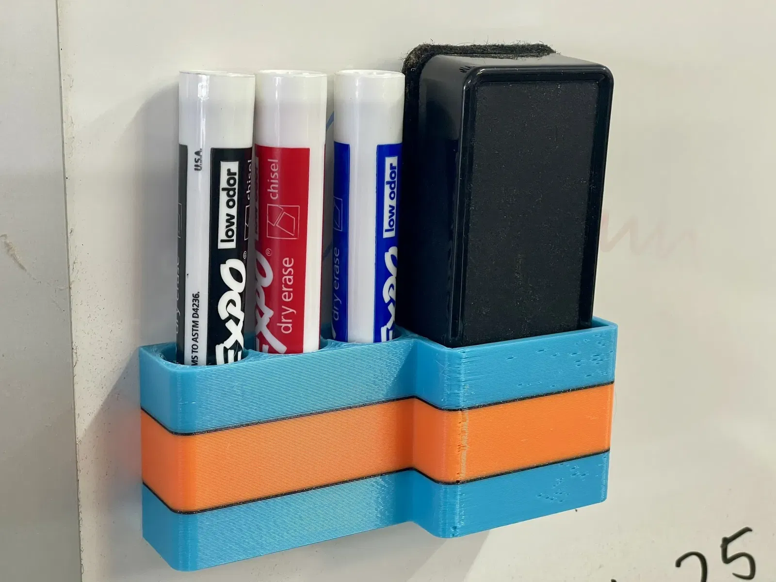 Giá đỡ cho cục tẩy bảng trắng Expo của bạn và 3 bút đánh dấu, với không gian để dán nam châm hình chữ nhật 20x5x2mm ở mặt sau.