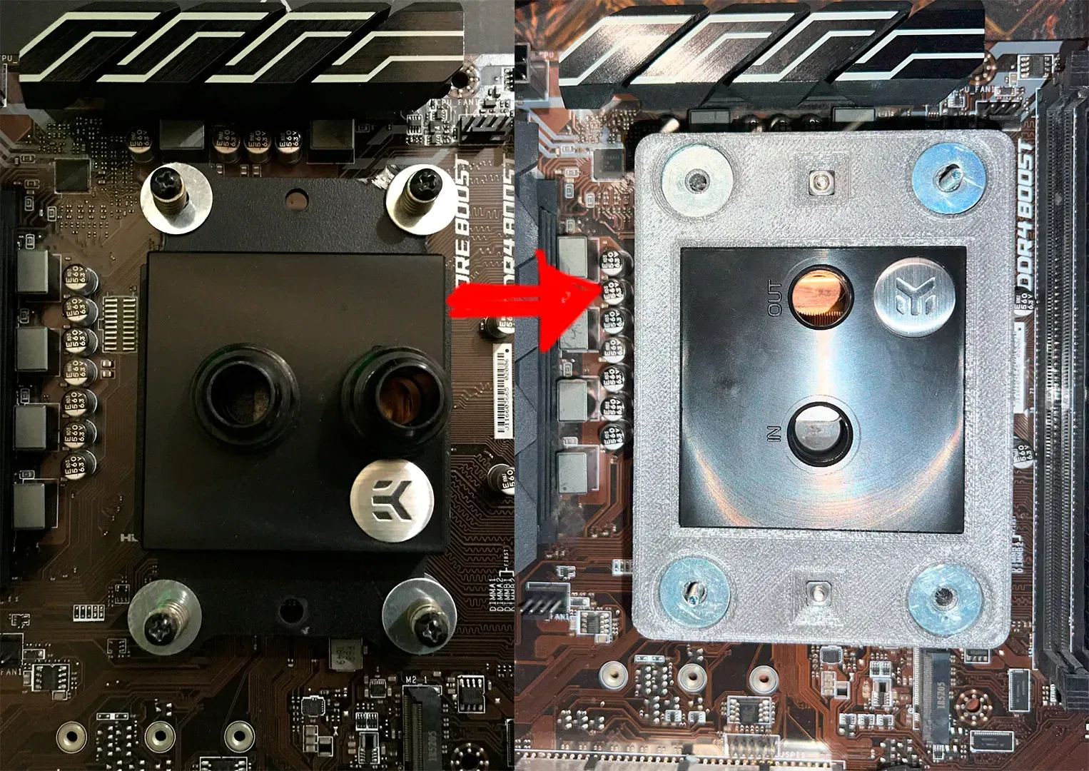 Tôi có một bộ làm mát CPU bằng đồng acetal EKWB supremacy cũ nhưng vẫn có khả năng, nhưng không có giá đỡ AM4, chỉ có AM3. Trong 3 năm đầu sử dụng, tôi đã sử dụng khối này bằng cách chế tạo lại tấm gắn AM3 như trong hình, với các vòng đệm, nhưng rất khó để lắp đặt, khi nâng cấp CPU tôi đã quyết định giải quyết vấn đề này.