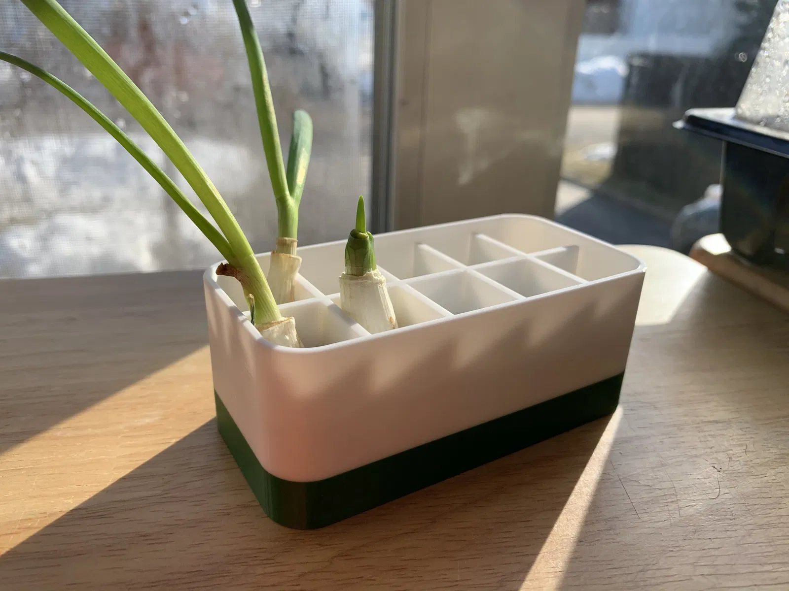 Một nồi nhỏ với sự tách biệt để giúp tái sinh hành lá và các loại rau hoặc thực vật nhỏ khác mà không rơi xuống.