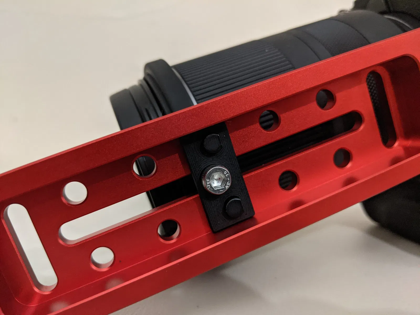 Thiết kế tổng thể sử dụng một vòng kẹp (với vít M3) cho ống kính, hỗ trợ ống kính và giảm thiểu chuyển động khi máy ảnh được xoay trong quá trình theo dõi sao. Phần gắn sử dụng hai chốt 6mm cách nhau 20mm ở giữa, và một lỗ trung tâm cho vít M5 từ bên dưới. Bảng kết nối phía dưới (hoặc t-nut, hoặc bất cứ thứ gì) hoạt động như một vòng đệm cho vít M5, và giúp giữ mọi thứ thẳng hàng.