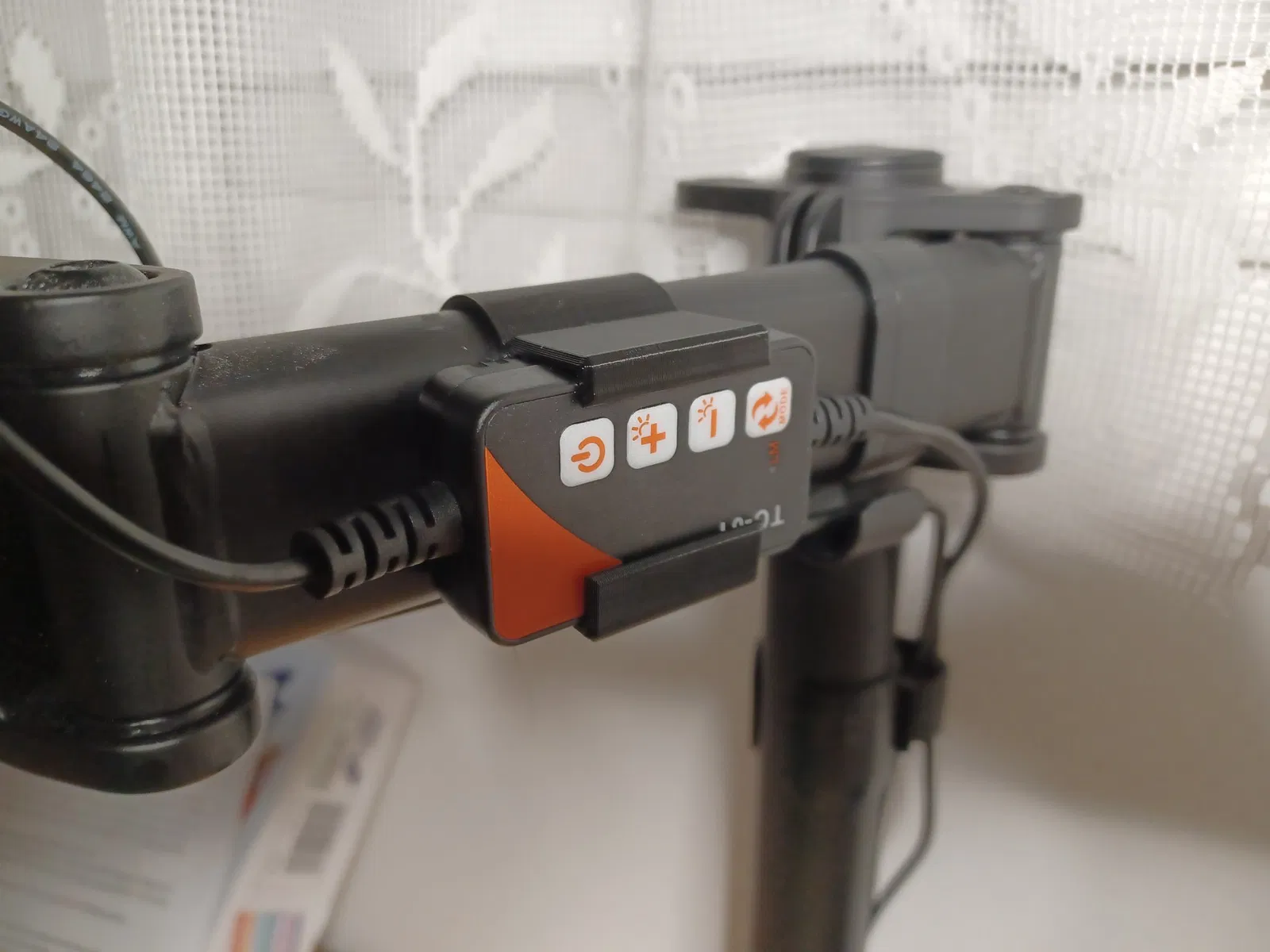 Clip để đính kèm đèn LED Neewer của tôi và điều khiển điều khiển từ xa đến một cánh tay màn hình để chiếu sáng quá đầu