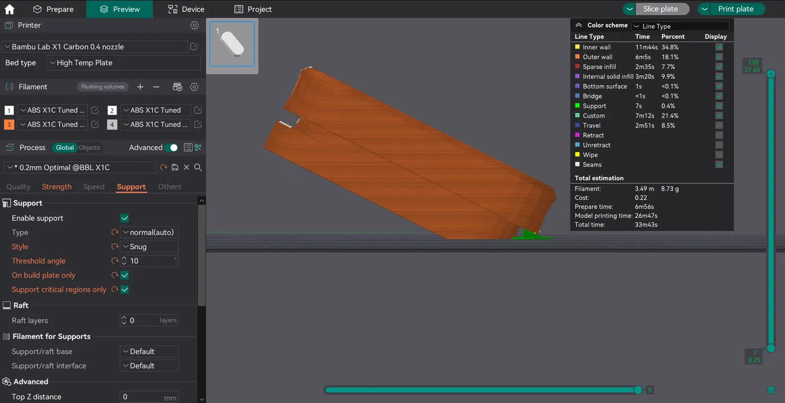 Phần này đã ở trong hướng in tối ưu và sẽ cần một lượng hỗ trợ nhỏ ở góc thấp nhất. Tôi đã đặt eSlicer ở chế độ hỗ trợ Bình thường, Chặt chẽ, với Góc Ngưỡng 10 độ (xem ảnh chụp màn hình). Tôi cũng đang in với 6 lớp và 30% Khối để tăng cường độ bền trong ABS trên Bambu Lab X1C. Trong chế độ Điên cuồng, một grommet in trong khoảng 17 phút với các cài đặt này, nhưng tùy thuộc vào máy của bạn và cài đặt in, thời gian in của bạn có thể khác nhau.