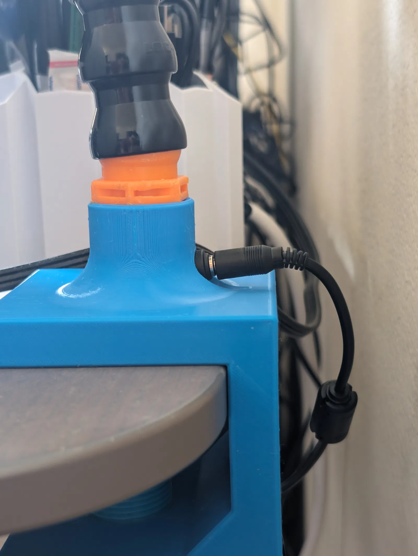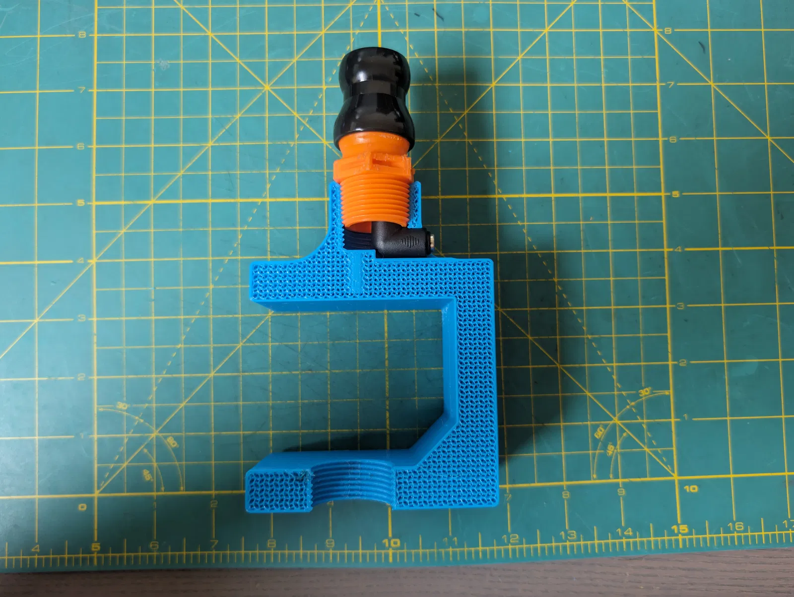 Đã remix phần clamp để có ren cái NTP 3/4" để tôi có thể sử dụng với chân đế NTP Loc-Line. Sử dụng bộ chuyển đổi 90 độ này từ Amazon và nó vừa khít vào lỗ. https://www.amazon.com/gp/product/B07MJG6NR9/ Để lắp ráp, tôi khuyên bạn nên tách 1-2 đoạn Loc-Line của bạn sau chân đế có ren. Chạy dây và khung qua và thực hiện kết nối. Sau đó, vặn vào chân đế, chỉ cần xoay phần nhỏ của Loc-Line. Khi các ren cái 3/4 đã vào hết trong chân đế, thì thực hiện kết nối. Bằng cách này, bạn không cần phải xoay toàn bộ chiều dài của Loc-Line và làm dây bị rối bên trong. Đây là hình ảnh tham khảo từ một bản in thất bại: