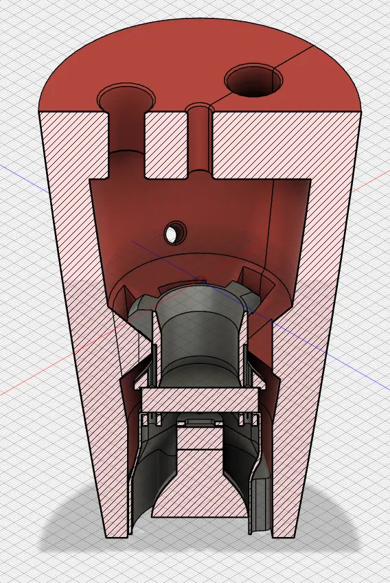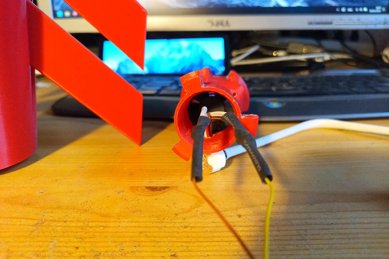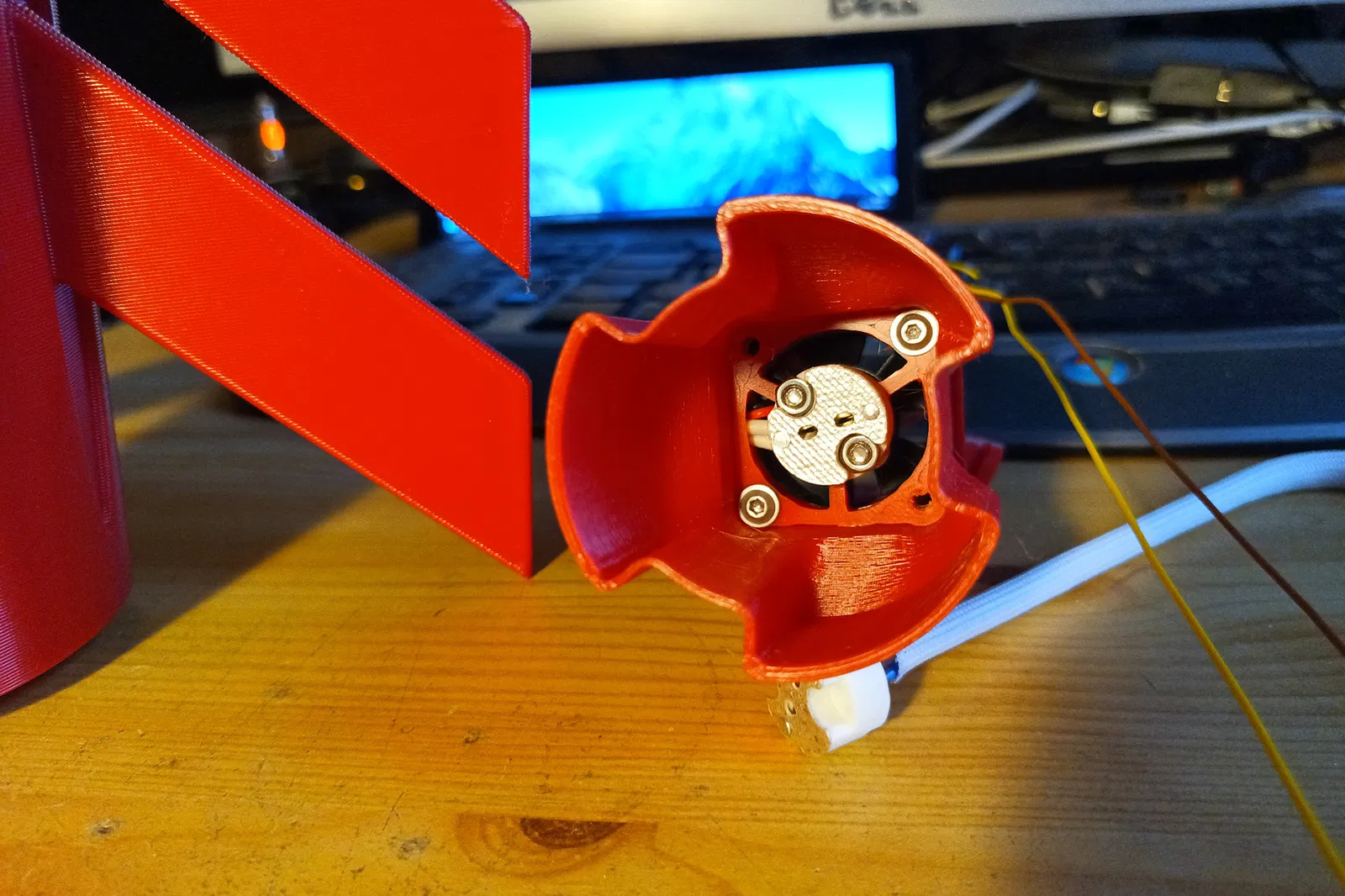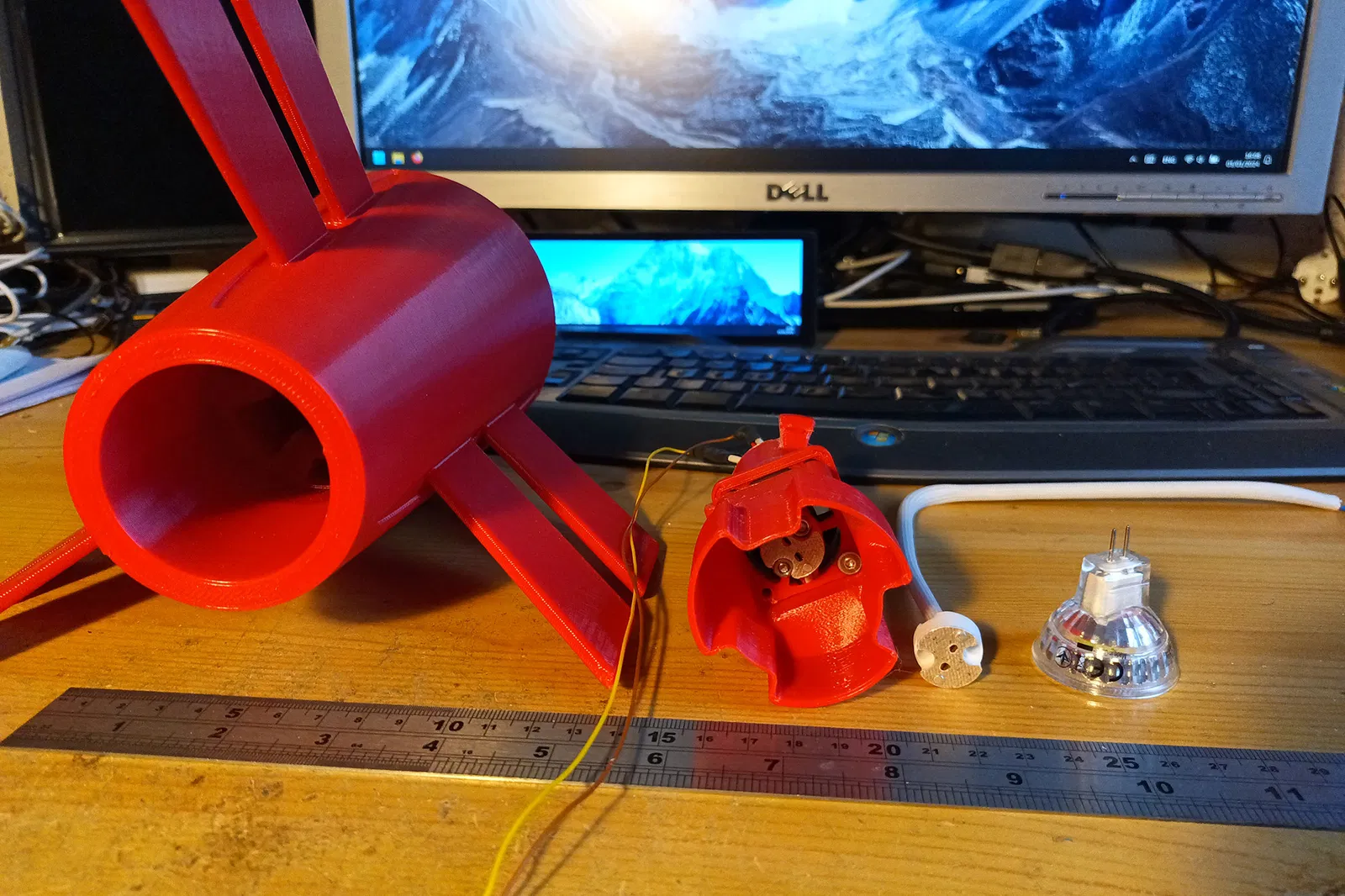 Ý tưởng là có một bóng đèn GU4 chiếu sáng xuống ngọn lửa trong suốt. Vì ngay cả bóng đèn LED cũng có thể tạo ra nhiệt trong PLA, nên có một quạt nhỏ để lưu thông không khí.