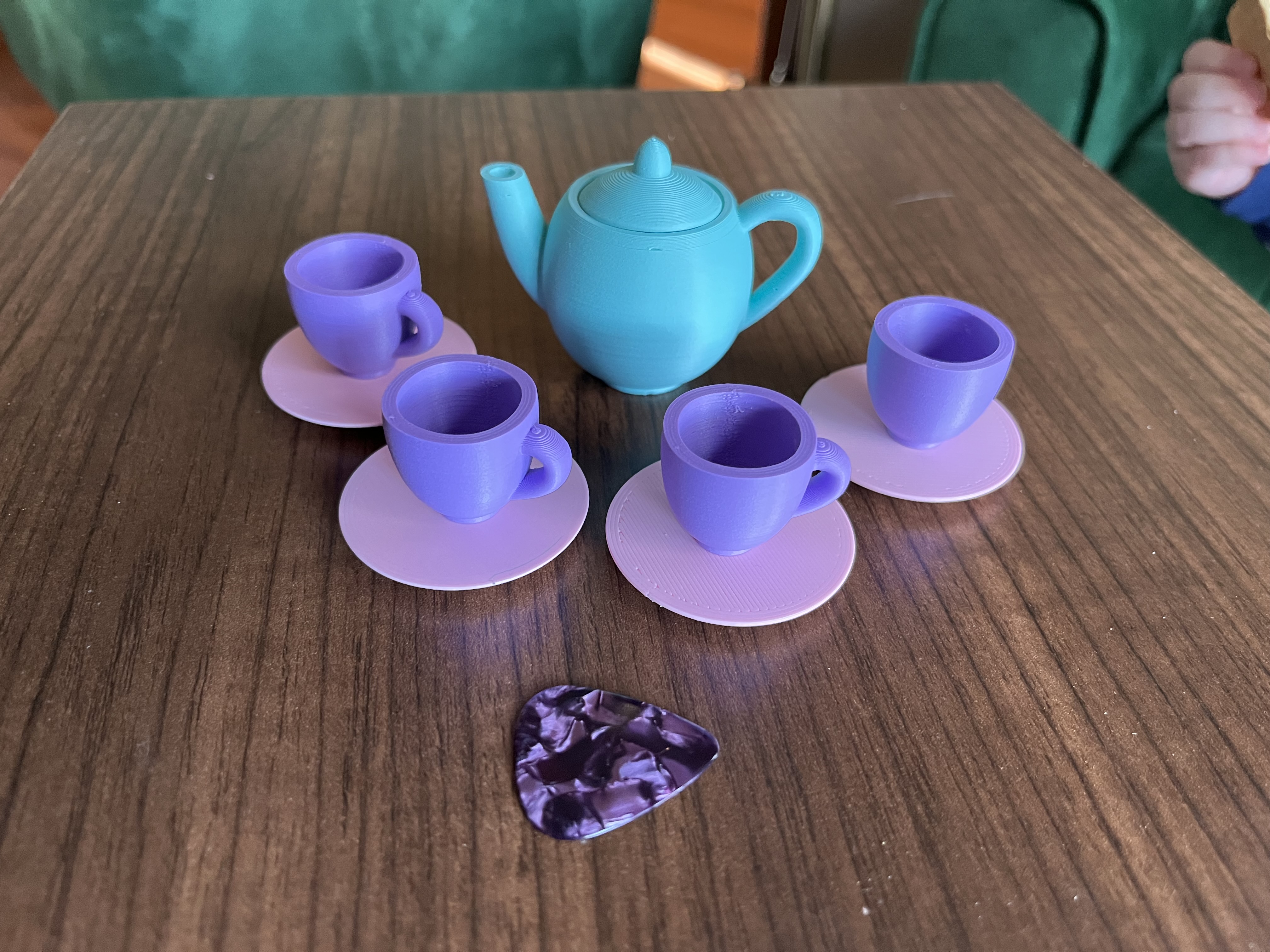 Tôi đã thiết kế bộ trà nhỏ này cho con tôi sử dụng với động vật nhồi bông và búp bê của chúng. Kích thước in ở mức 100% được hình ảnh bên cạnh một lựa chọn guitar tiêu chuẩn. Có thể được thu nhỏ lên hoặc xuống. Các tấm nên được in lộn ngược, nếu không chúng yêu cầu hỗ trợ.