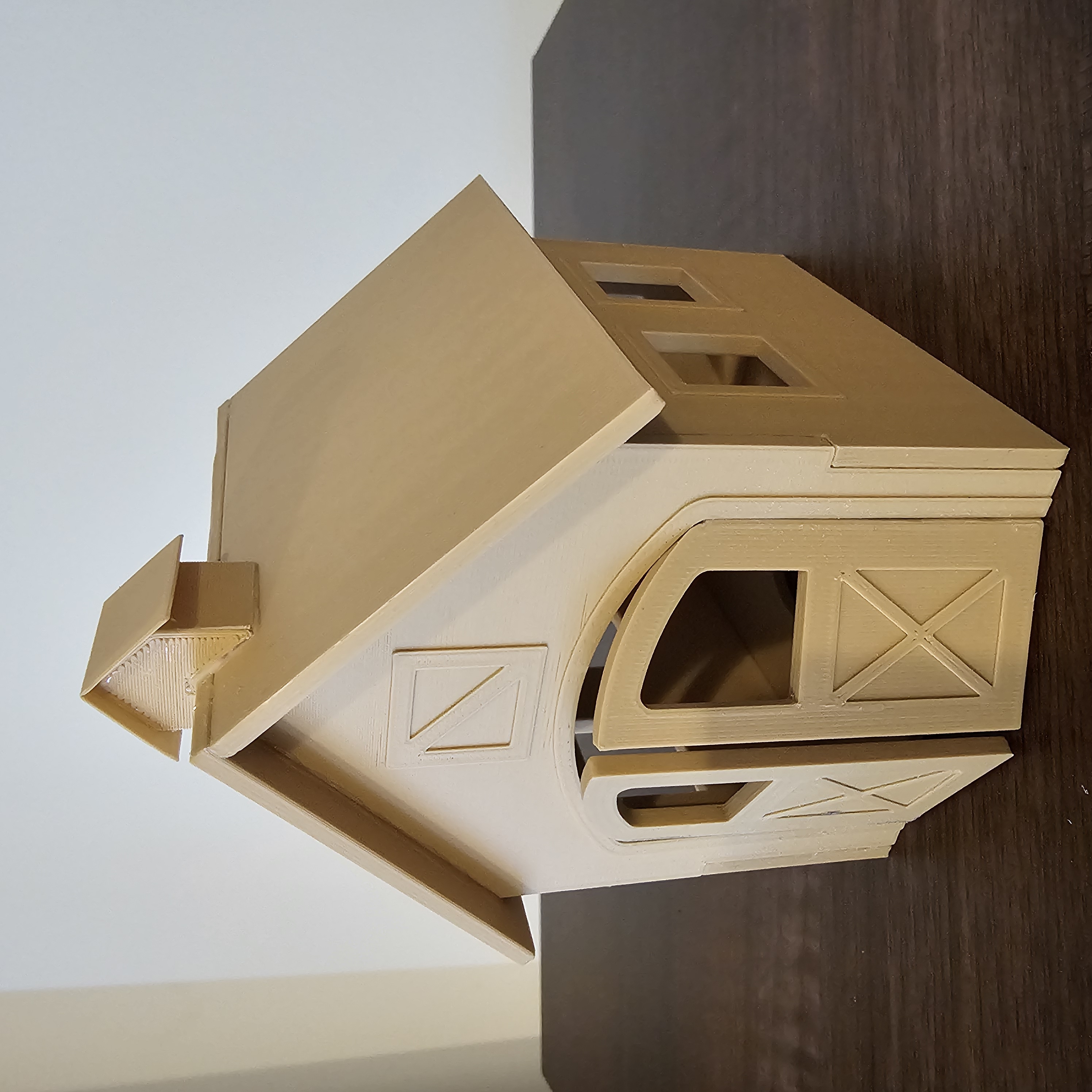Ngôi nhà xe ngựa này là một trong 6 tòa nhà nhỏ trong bộ Greenleaf Village, dành cho dịp Giáng Sinh hoặc trang trí đường tàu. Cái tôi có từ khoảng 30 năm trước được làm từ gỗ dán ép (không phải cắt laser) rất giòn và dễ bị nứt khi tôi cố gắng lấy các mảnh ra. Vì vậy, tôi quyết định thử tái tạo lại mô hình này trên máy Prusa của mình. Đây là phần đầu tiên tôi hoàn thành.