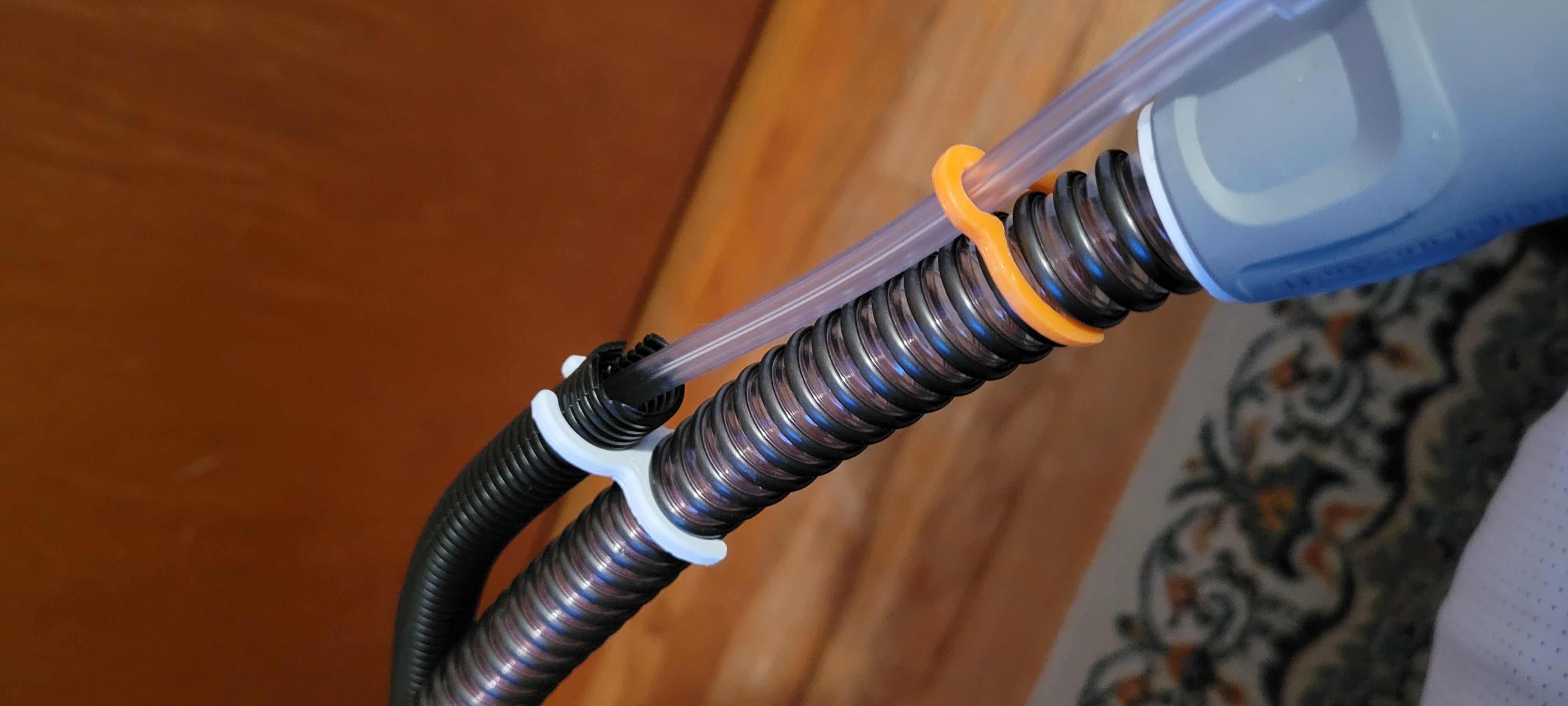 Cái kẹp này sẽ giữ ống oxy cùng với ống CPAP lại với nhau để di chuyển dễ dàng hơn, với ống oxy nằm bên trong dây quấn bảo vệ.