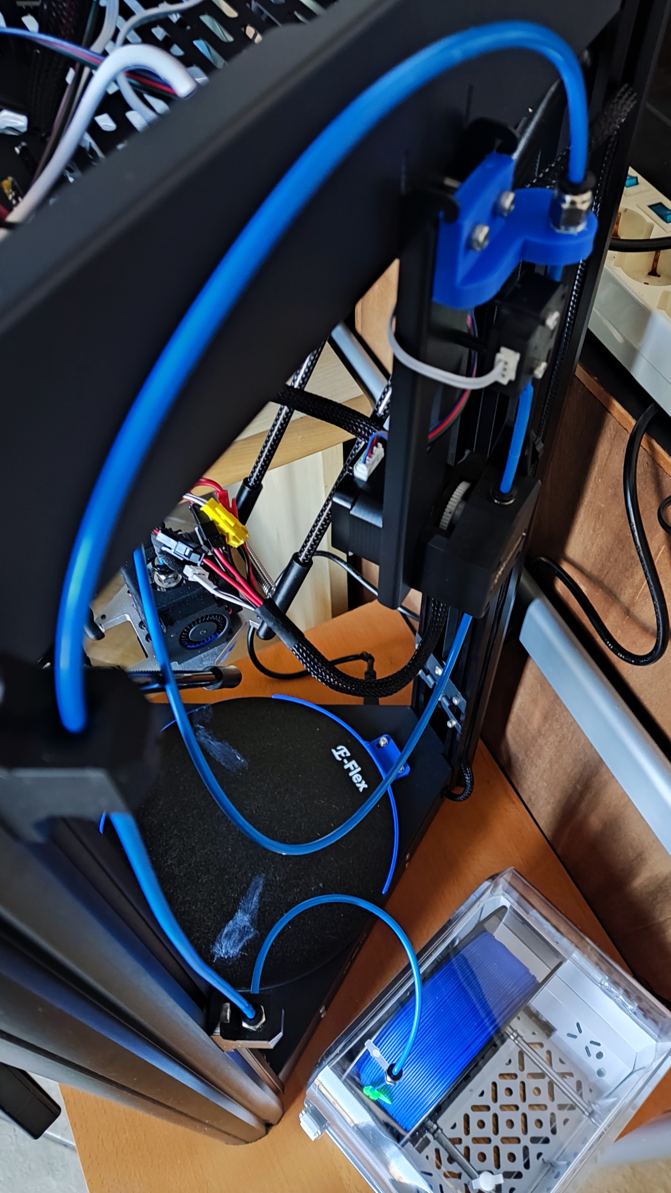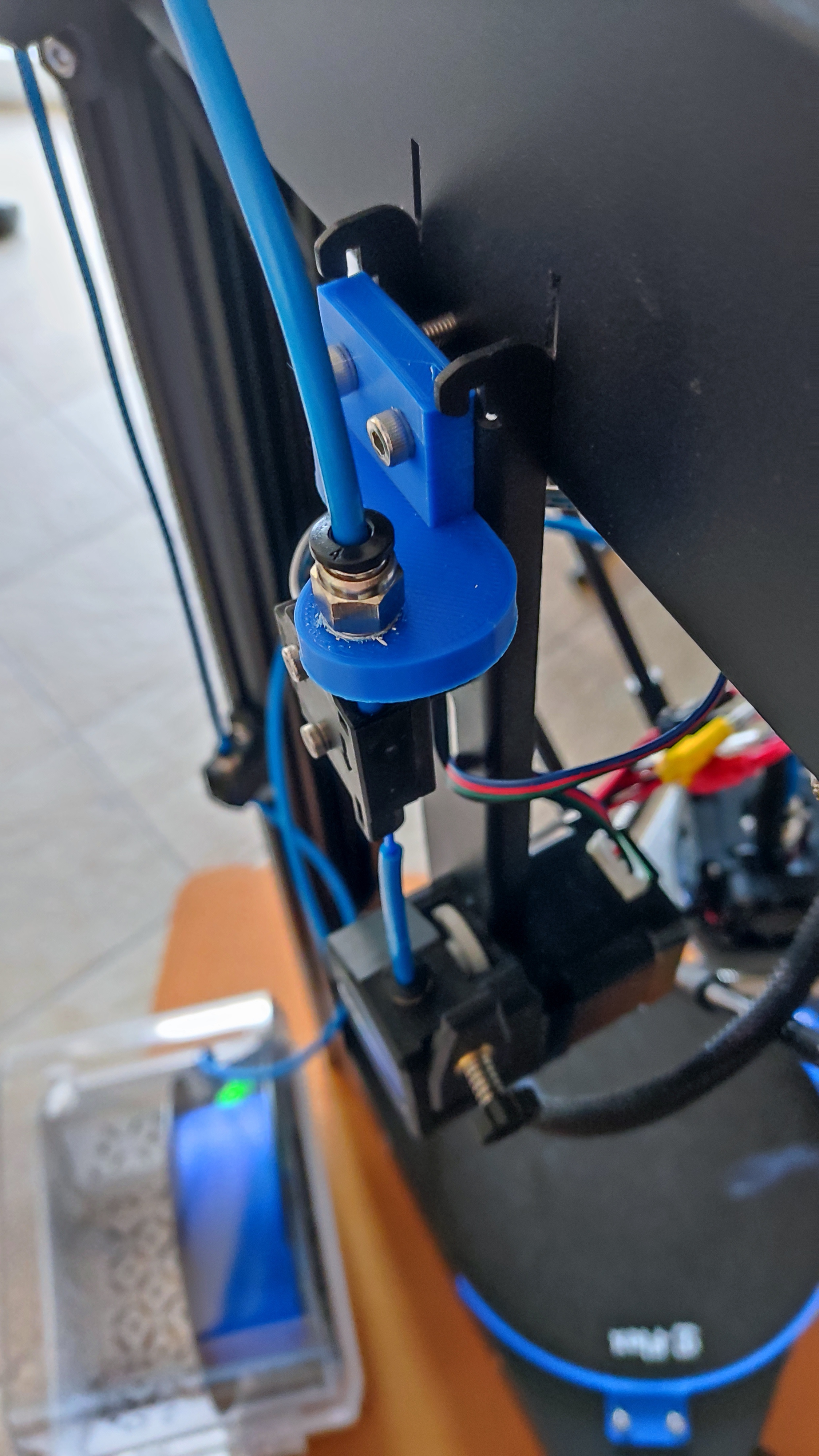 Thật tình thì cái món duy nhất của máy in này mà tui hổng có khoái là để cuộn dây tóc (filament) phía trên rồi phải luồn dây qua cái nắp. Thế là tui kiếm giải pháp trên mấy trang web mô hình 3D mà hổng có cái nào ưng ý hết trơn. Tui có in cả cái pát để hạ cái đầu đùn xuống, nhưng mà phải đổi chiều chuyển động bằng cách đảo dây trong đầu nối, mà vậy cũng hổng được.