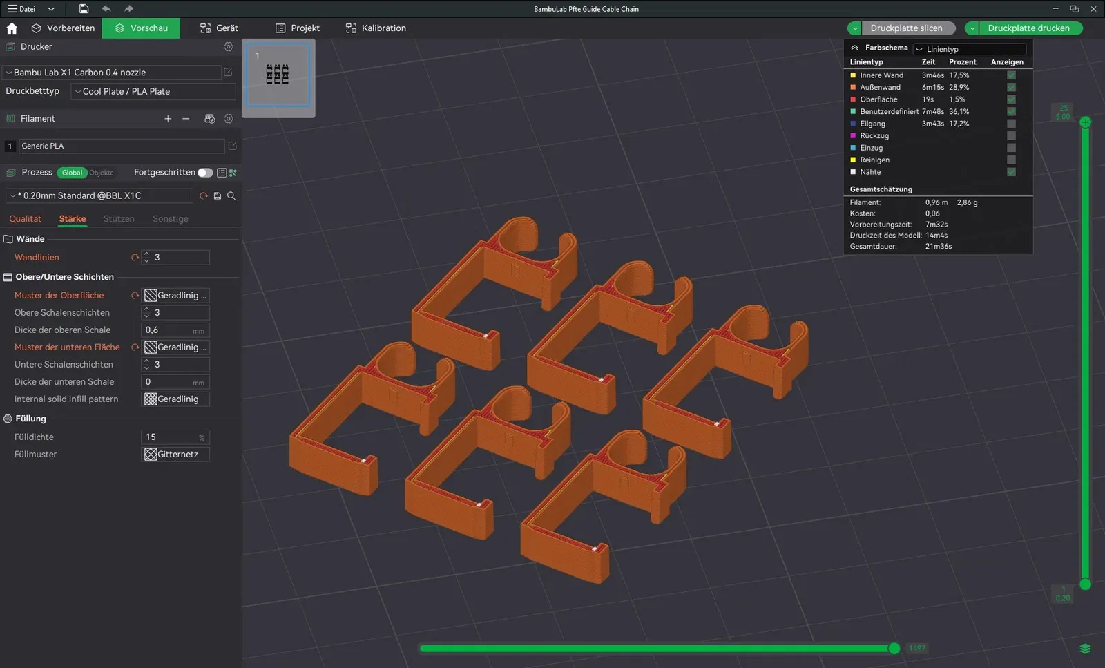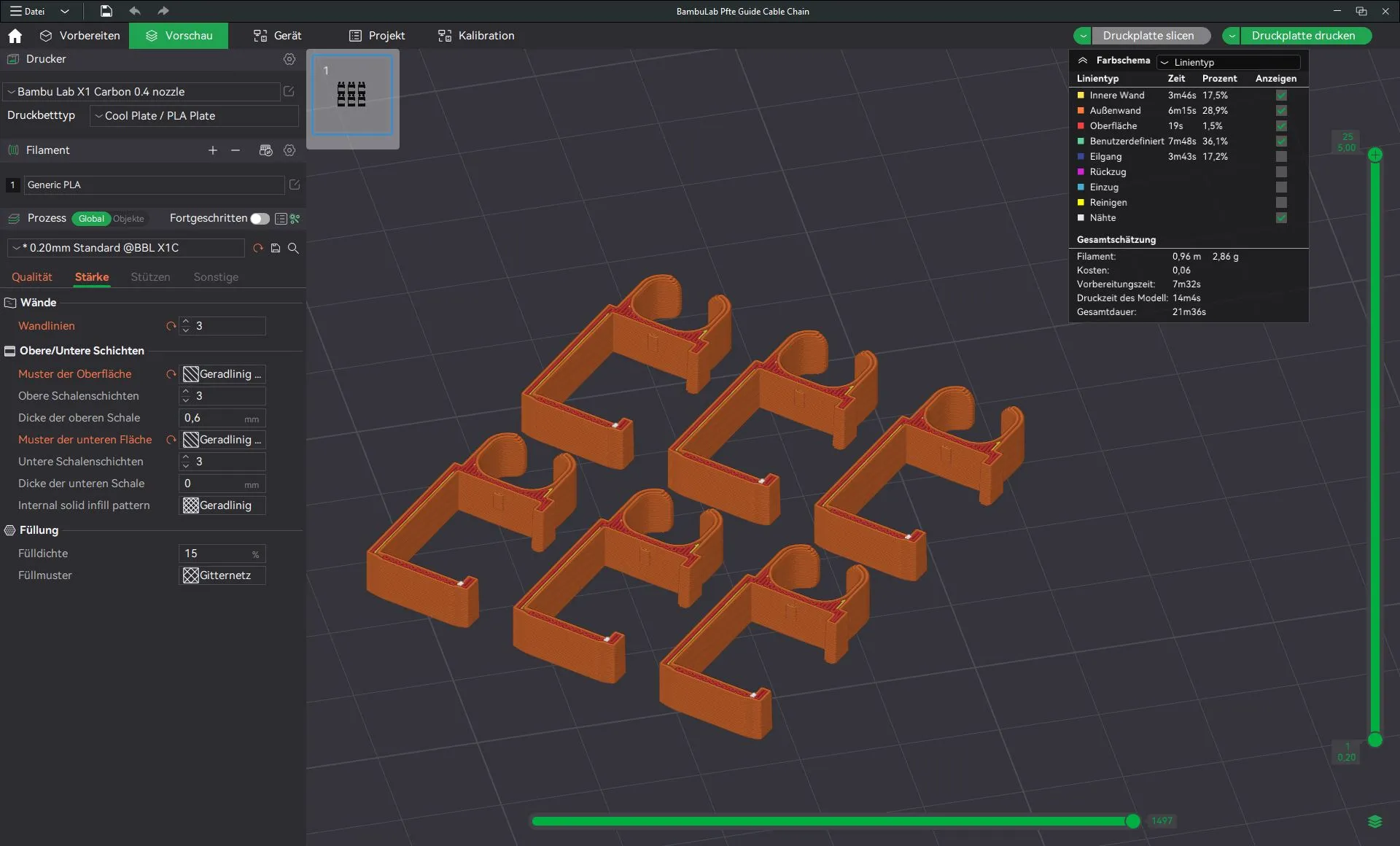 Vì một số máy in mới từ BambuLab có chuỗi cáp được sửa đổi, nên kẹp được thiết kế ban đầu không còn phù hợp nữa. Có hai biến thể, vui lòng kiểm tra xem bạn cần biến thể nào, nếu không kẹp sẽ không vừa. Sự khác biệt nằm ở chiều cao của chuỗi cáp: phiên bản cũ: chiều cao 14,4 mm --> in "biến thể cũ (14,4 x 9mm)". phiên bản hiện tại: 15,0 mm --> in "biến thể mới (15,0 x 9mm)".