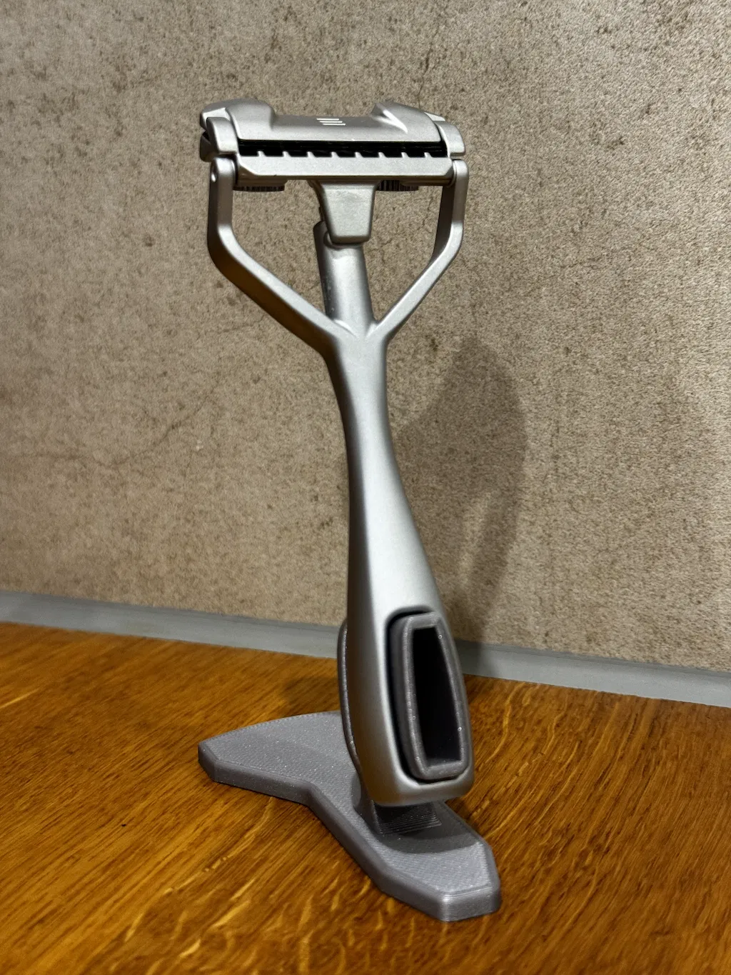 Phiên bản đầu tiên của đế giữ SHAVENT Compact, in bằng PLA. Phiên bản cập nhật có đế và bi sắt giúp giữ thăng bằng tốt hơn khi sử dụng.