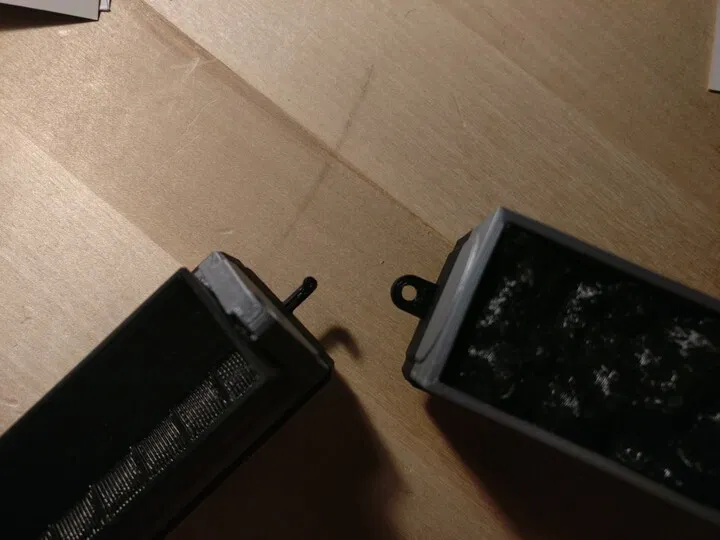 Bạn có thể dán các bộ phận trên của toa xe, nhưng tùy thuộc vào cài đặt máy in và dây tóc của bạn, bạn có thể sử dụng bốn kẹp 3 hoặc 4 mm bằng dây tóc 1.75 mm, một cái ở mỗi lỗ của thân xe và phần trên.