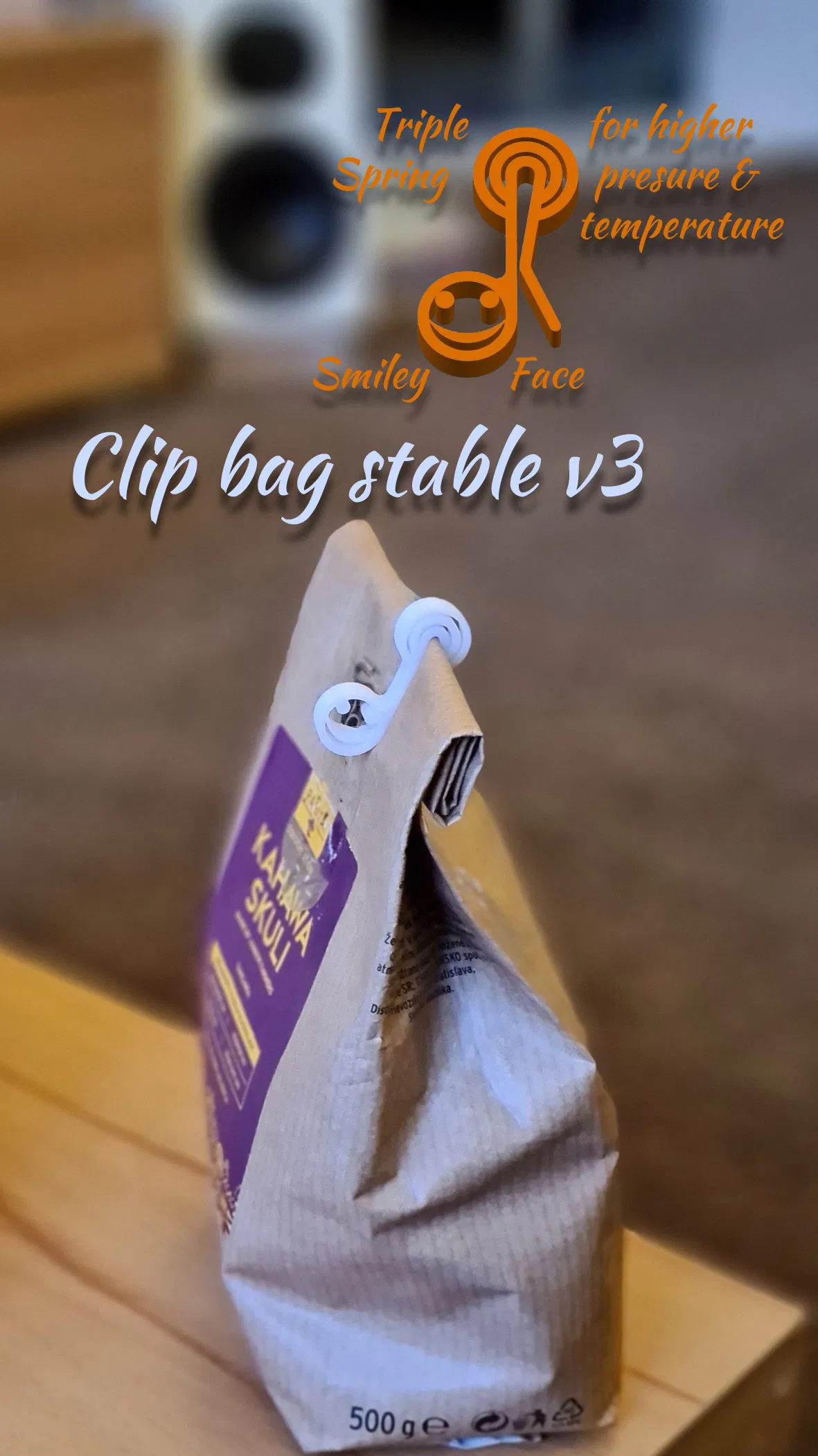 Kẹp túi nhỏ phiên bản V3 với mặt cười, được thiết kế lại để tăng độ ổn định và lực ép. Lý tưởng cho nhiệt độ cao, giúp đóng kín các loại túi hiệu quả hơn, đặc biệt là khi in bằng PETG với vòi phun 0.4mm.