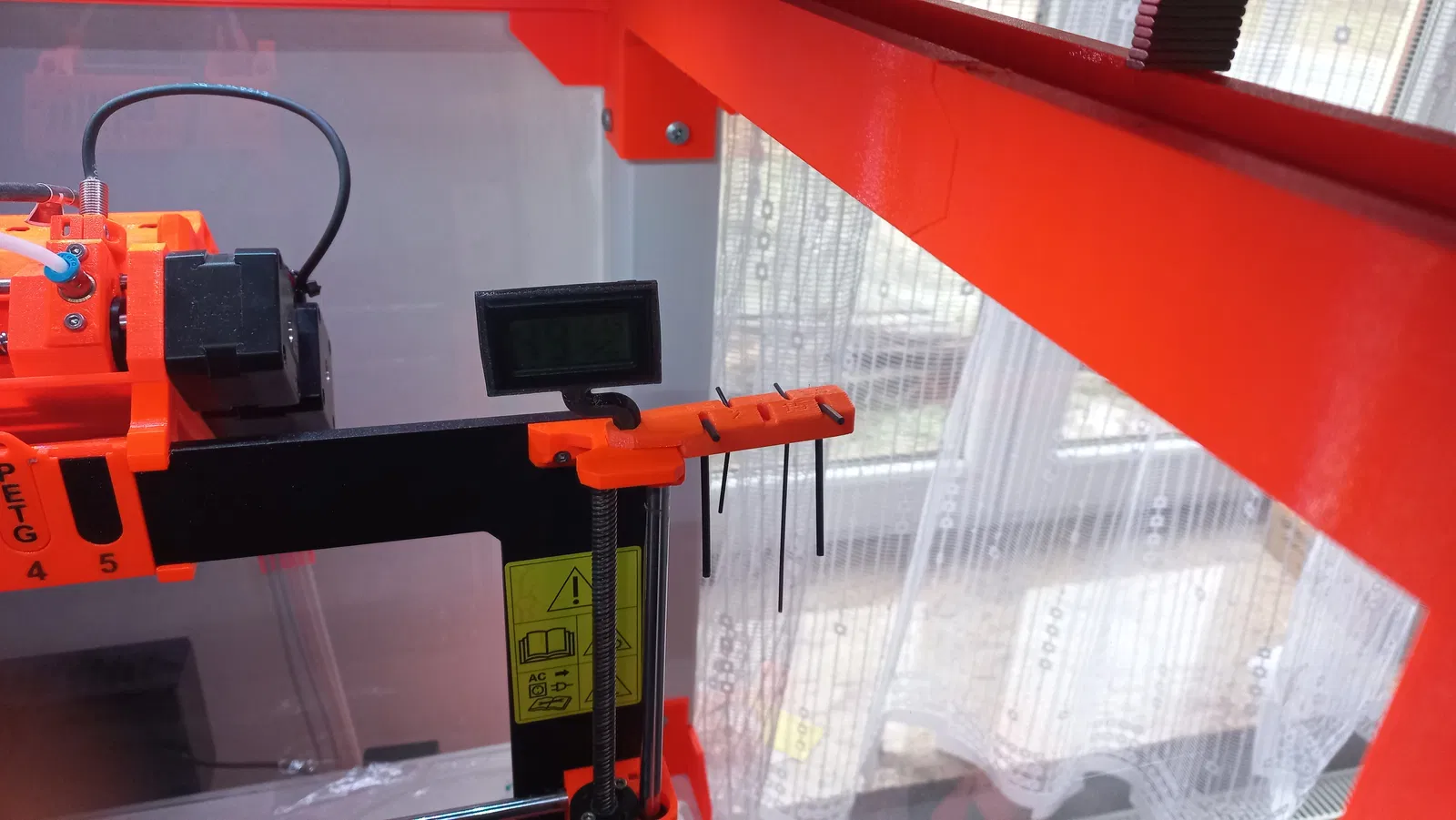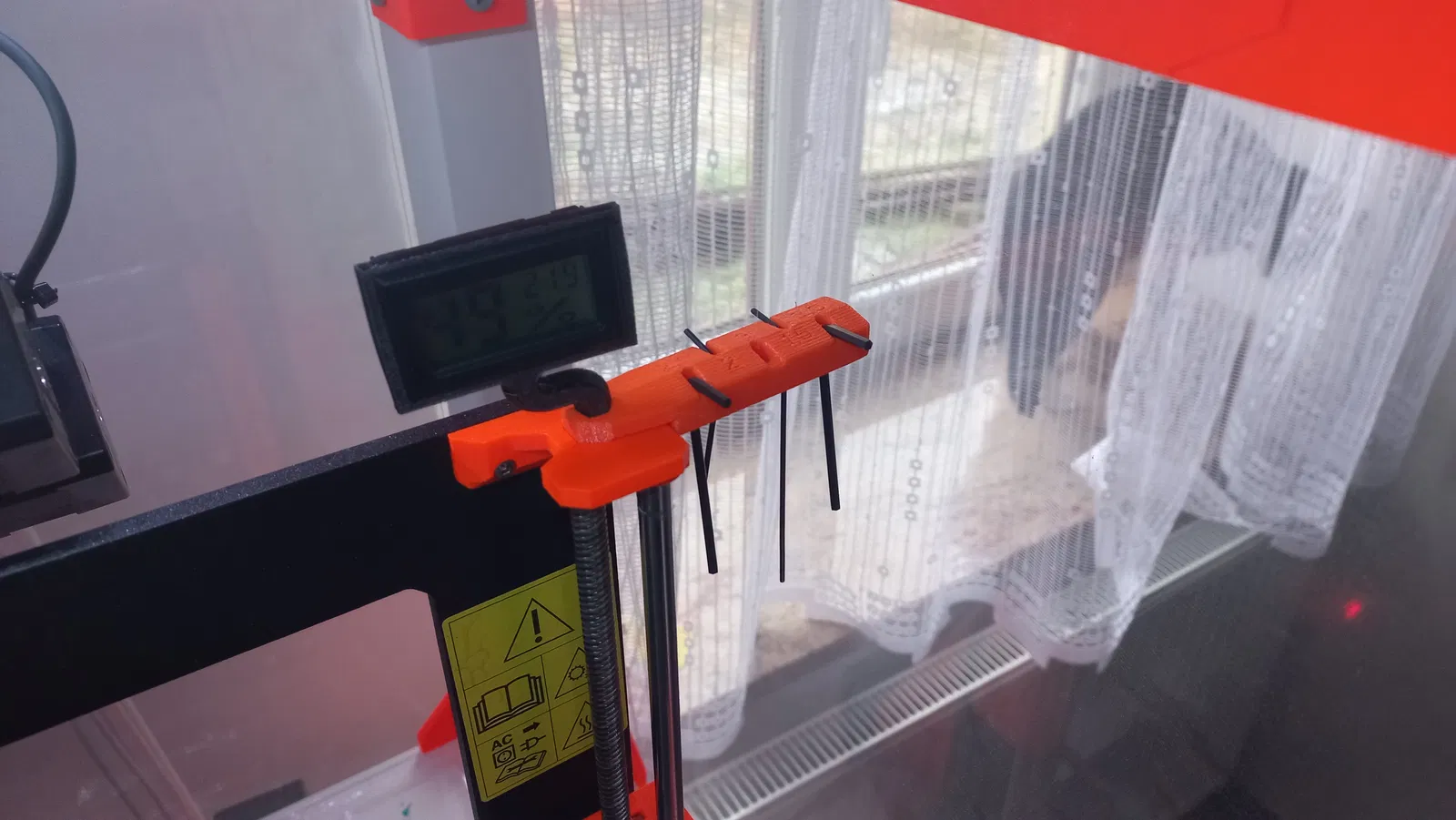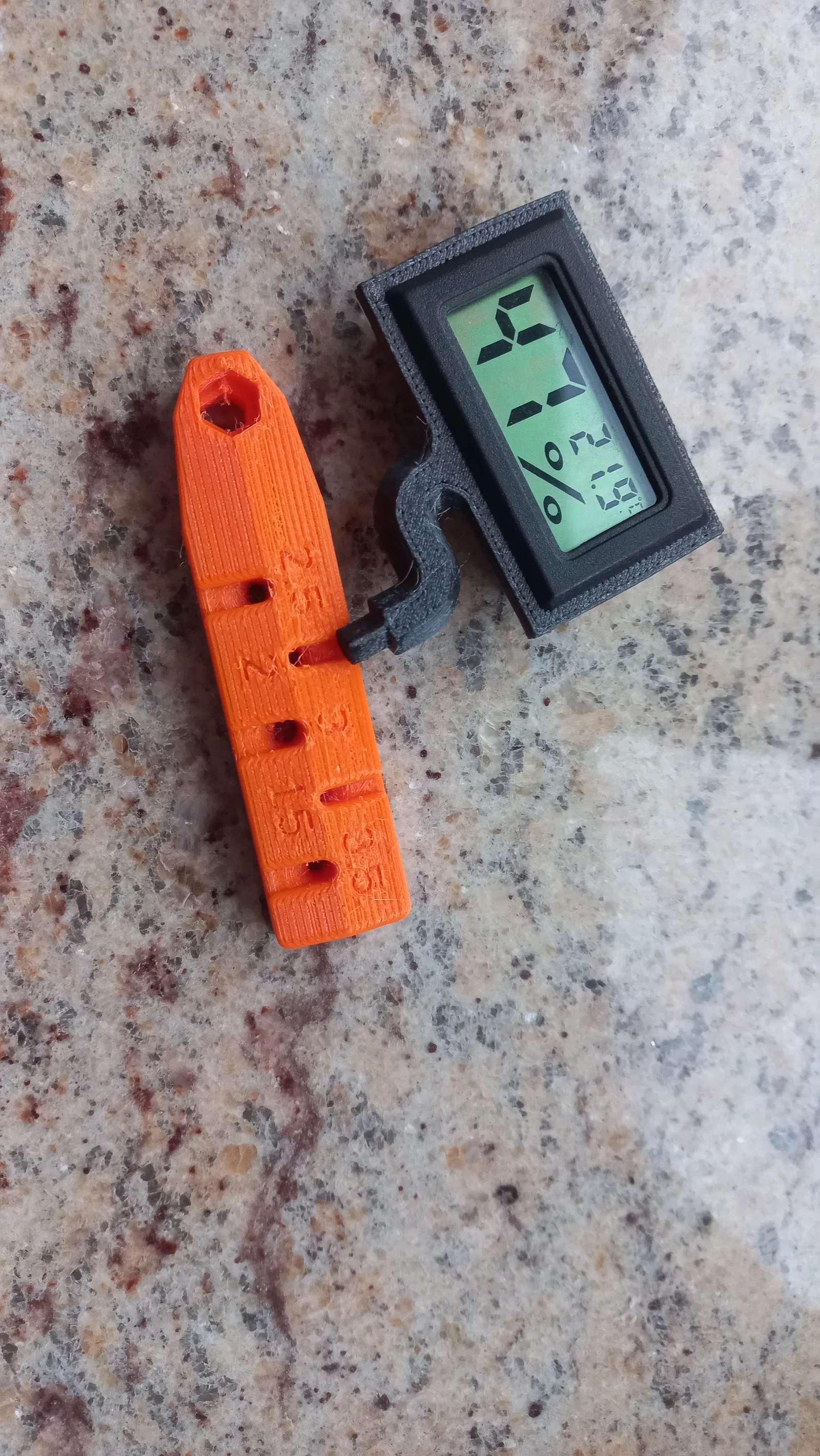 Mô hình kệ giữ lục giác tích hợp chỗ cắm nhiệt kế (hygrometer) cho máy in 3D Prusa MK3S. Chất liệu PET, lớp 0.2, độ đặc 20% hoạt động tốt. Phần giữ lục giác cần support, phần giữ nhiệt kế thì không.