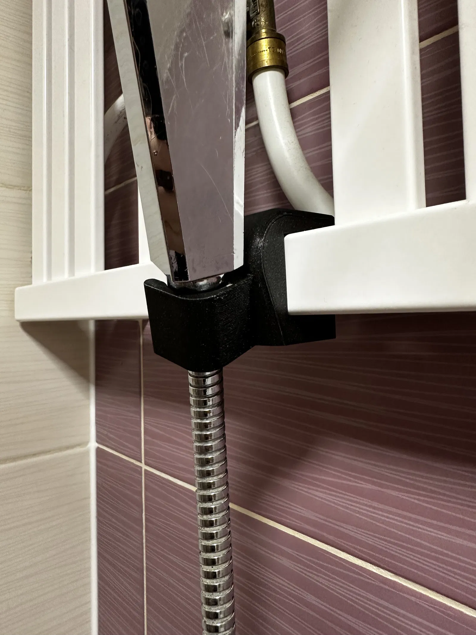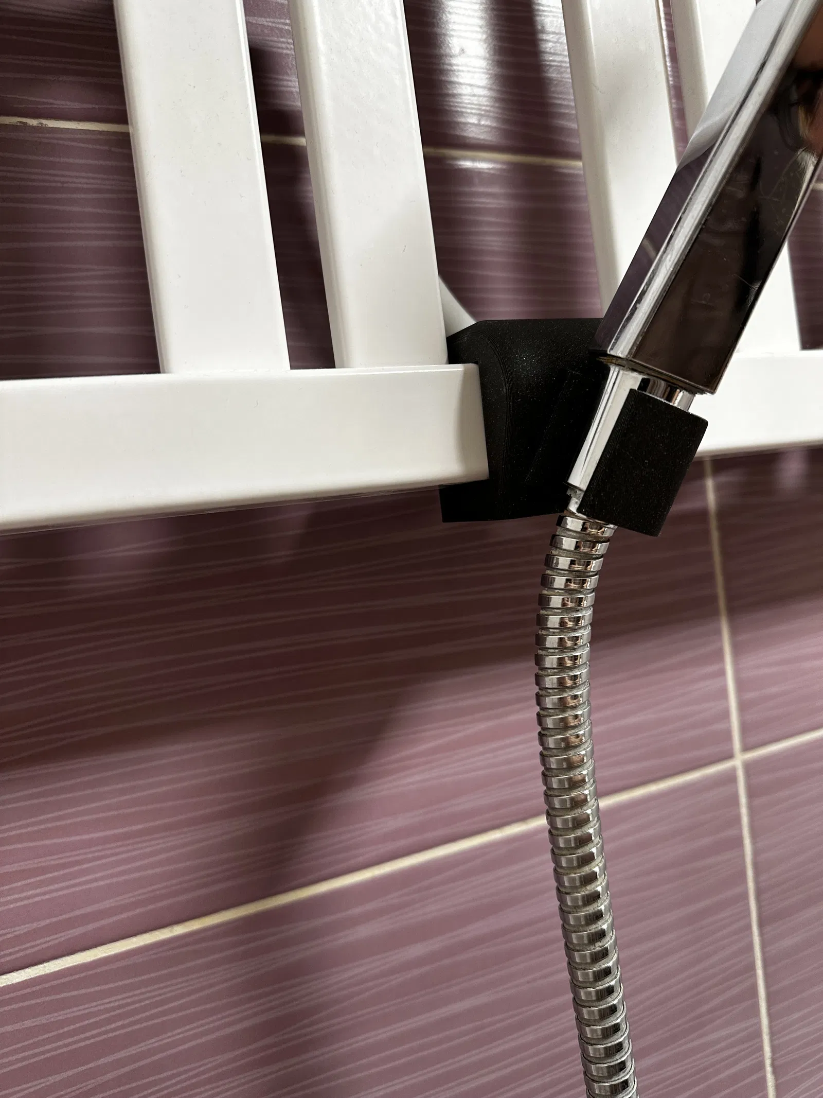 Kẹp giữ vòi sen bằng nhựa PLA, gắn vừa vặn vào Radiator vuông trong phòng tắm nhà bạn, chỉ cần trượt vào là xong. Có khe bên trong để gắn các miếng đệm, giúp giữ chắc hơn.