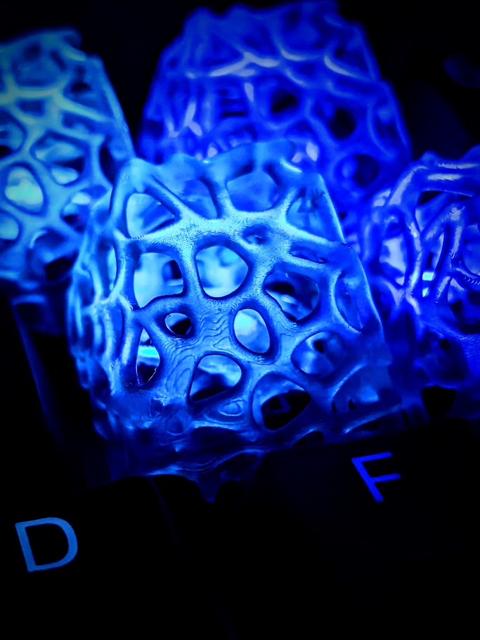 Keycap tương thích chân MX Cherry, có hoa văn Voronoi. Khuyến khích dùng máy in resin và nghiêng mô hình 15 độ so với mặt phẳng XY khi cắt lớp để đạt hiệu quả in tốt nhất. Cấu trúc chắc chắn nhờ hoa văn Voronoi, chỉ cần chống đỡ ở đáy.