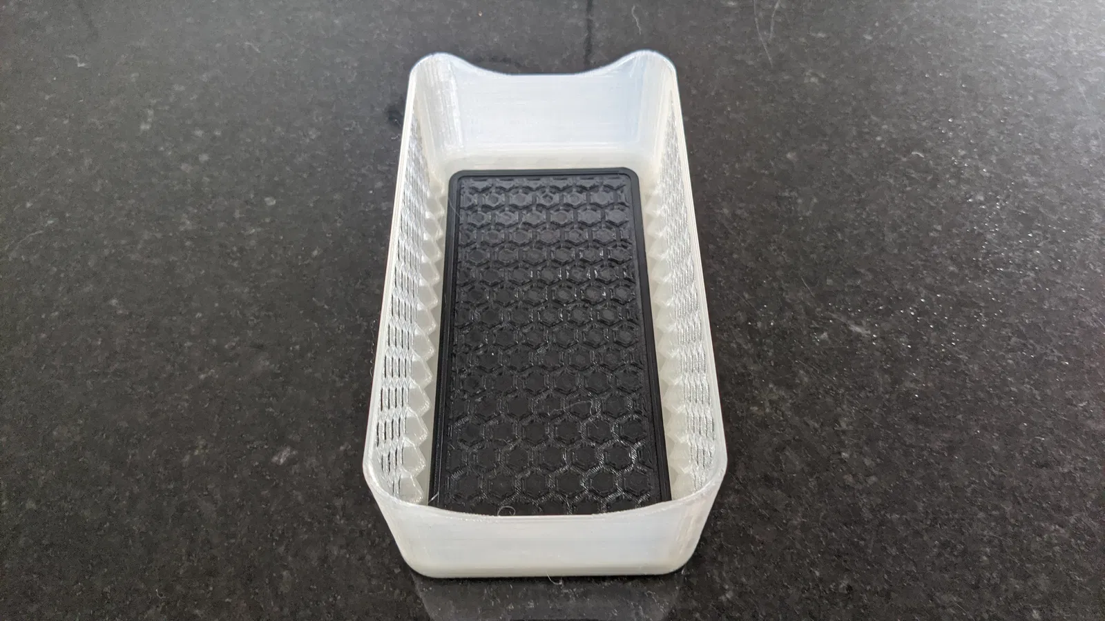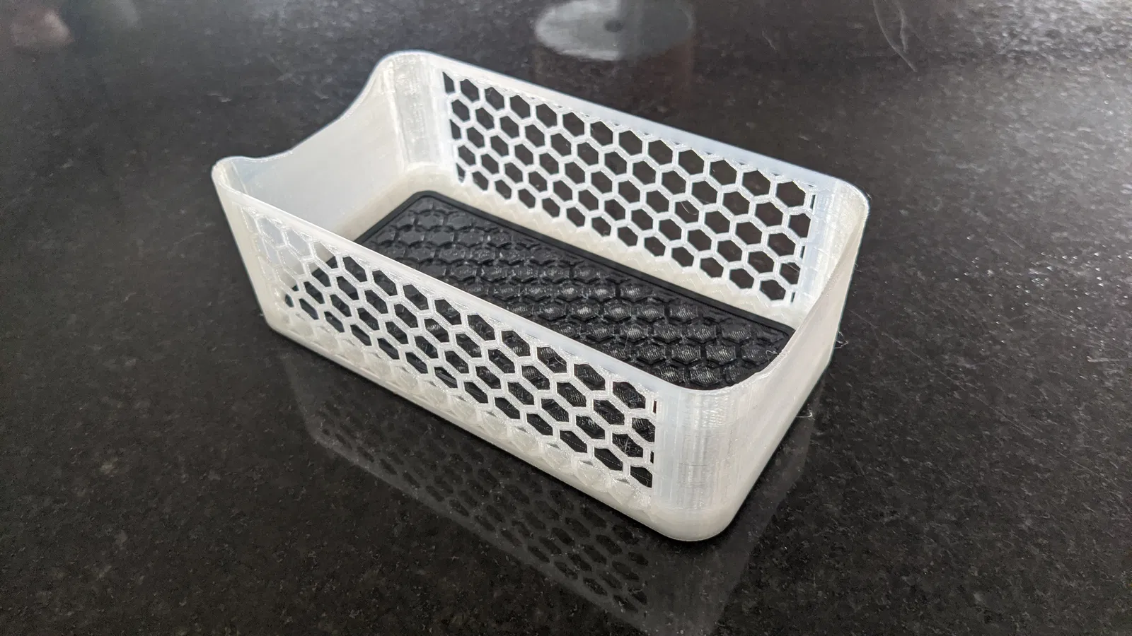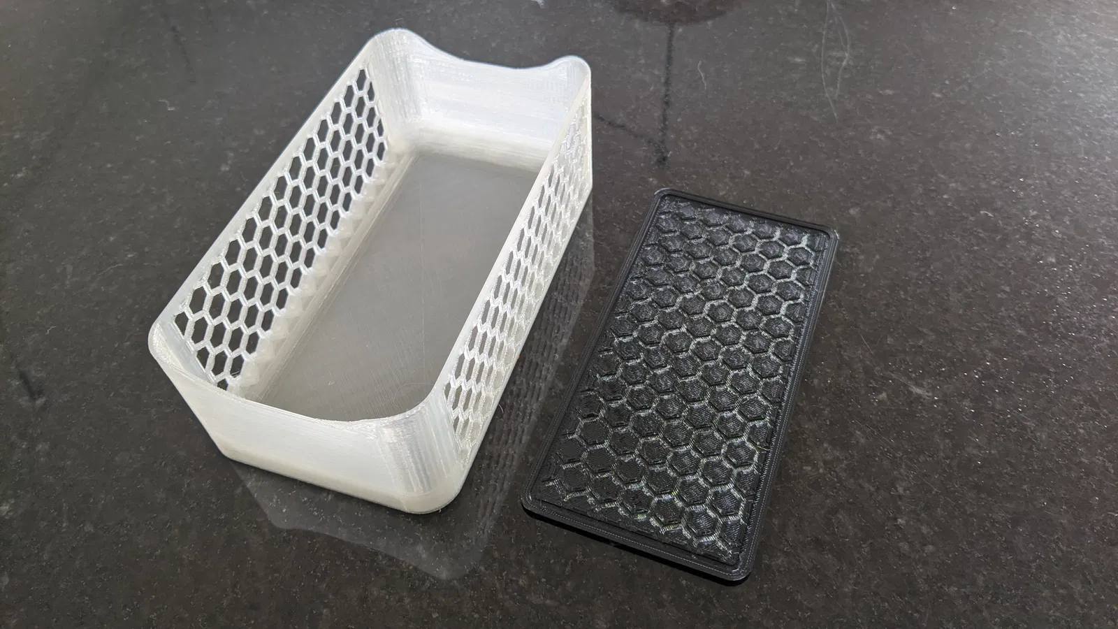 Thùng lưu trữ đơn giản với các khe hở hình lục giác ở hai bên, chủ yếu là cho ngoại hình nhưng cũng để tiết kiệm dây tóc ||||||| Sử dụng bởi chính nó hoặc in thảm hình lục giác phù hợp, tôi đã sử dụng TPU nhưng bạn có thể sử dụng PLA nếu bạn chỉ muốn thay đổi mẫu/màu